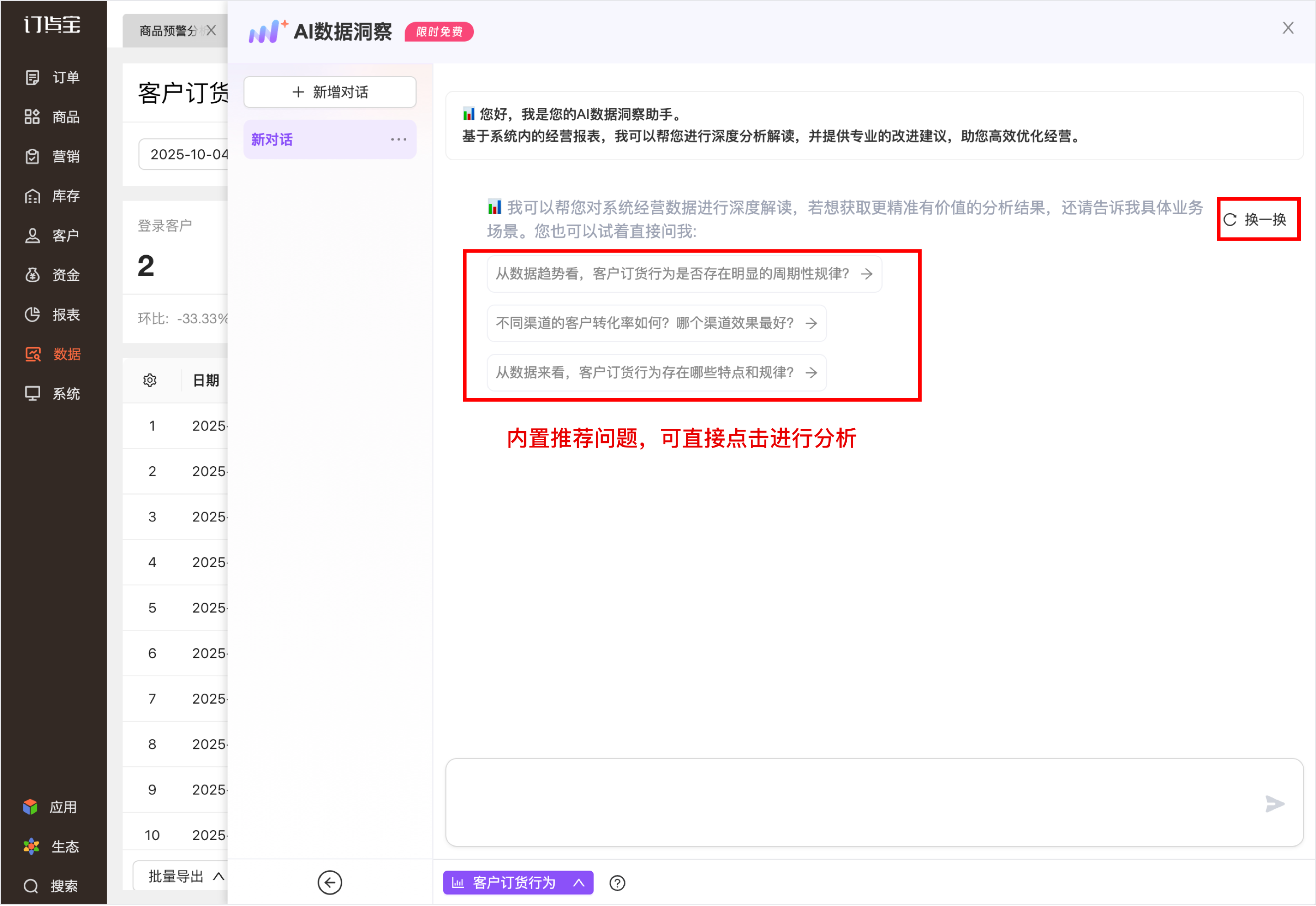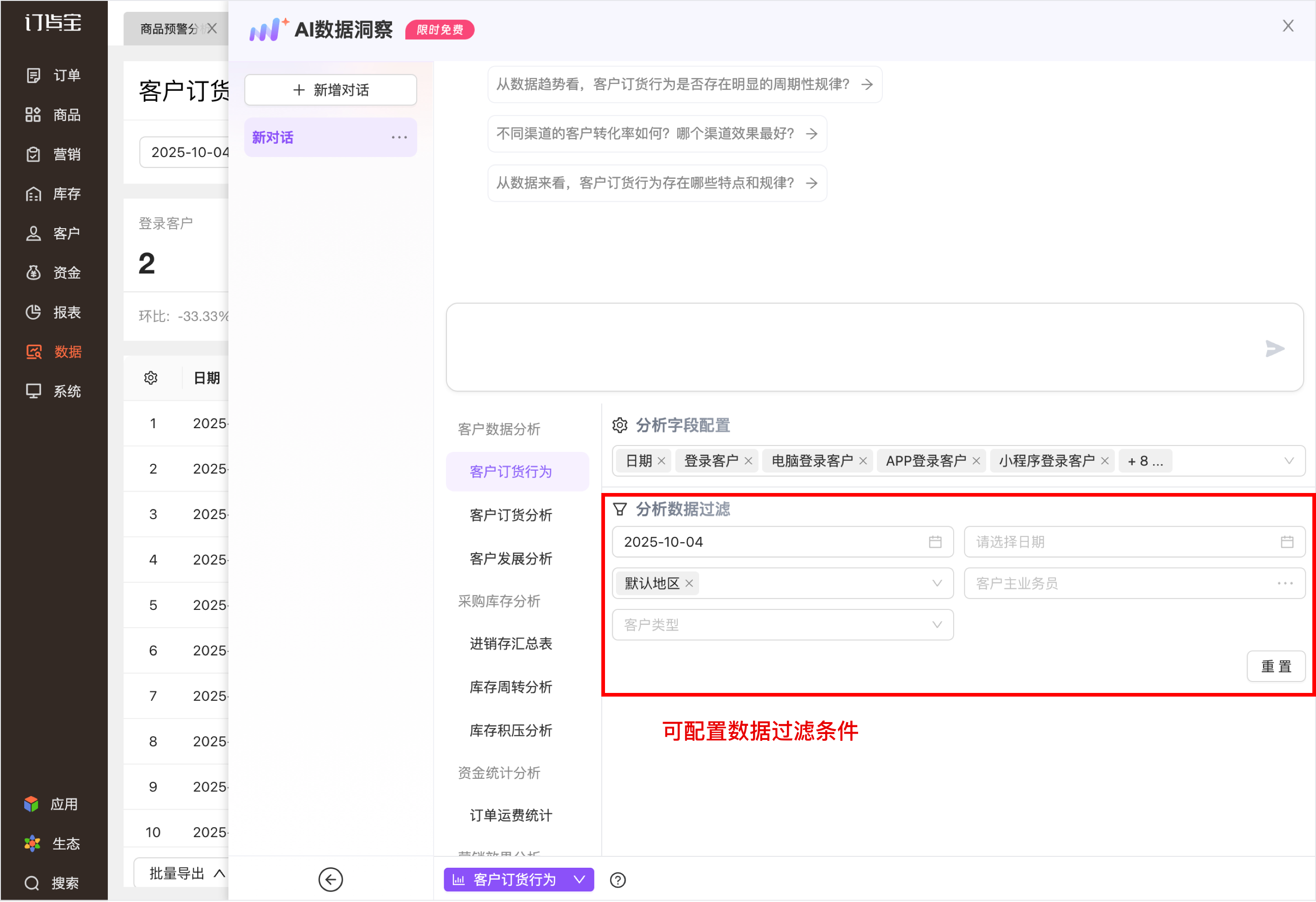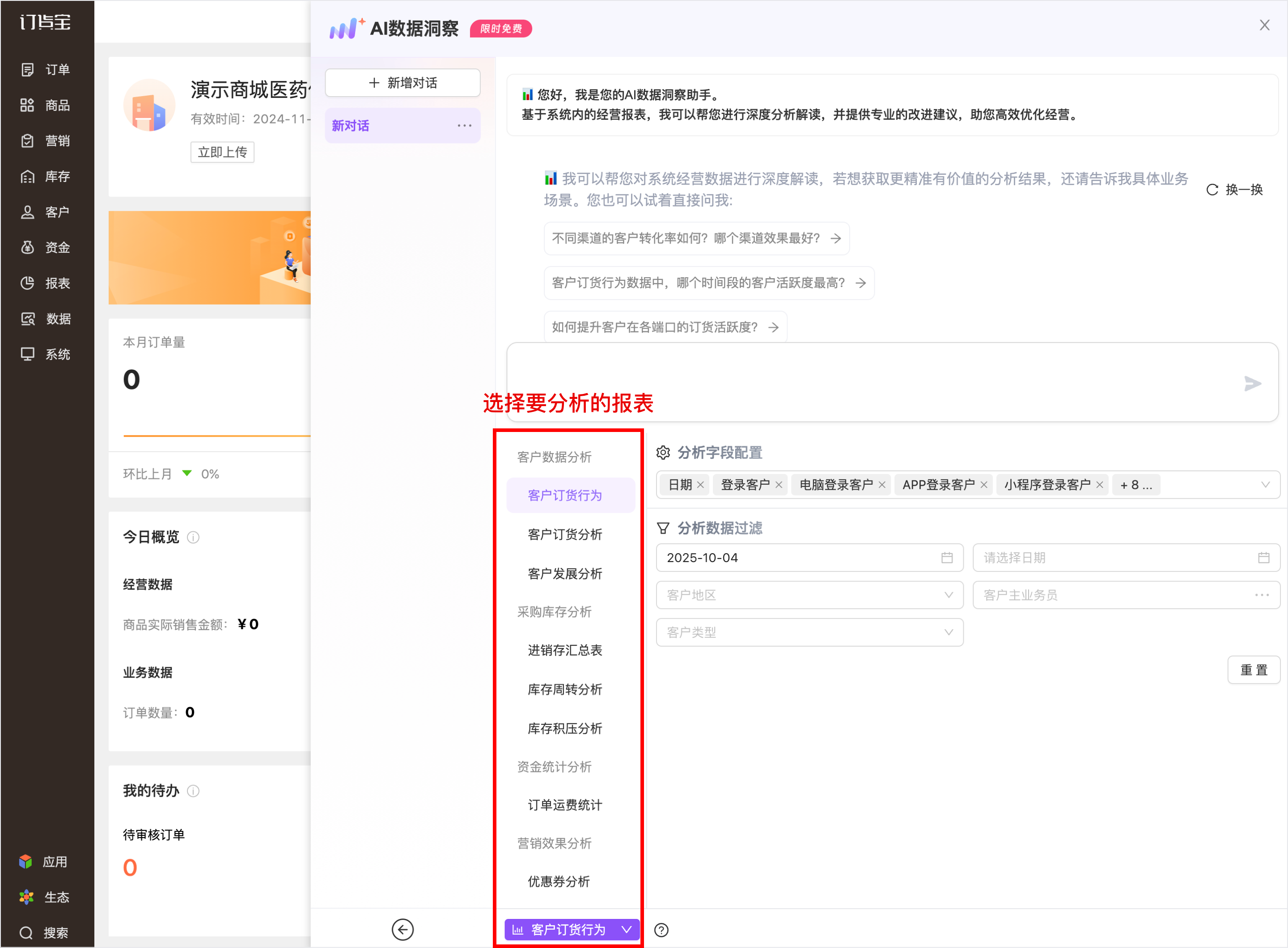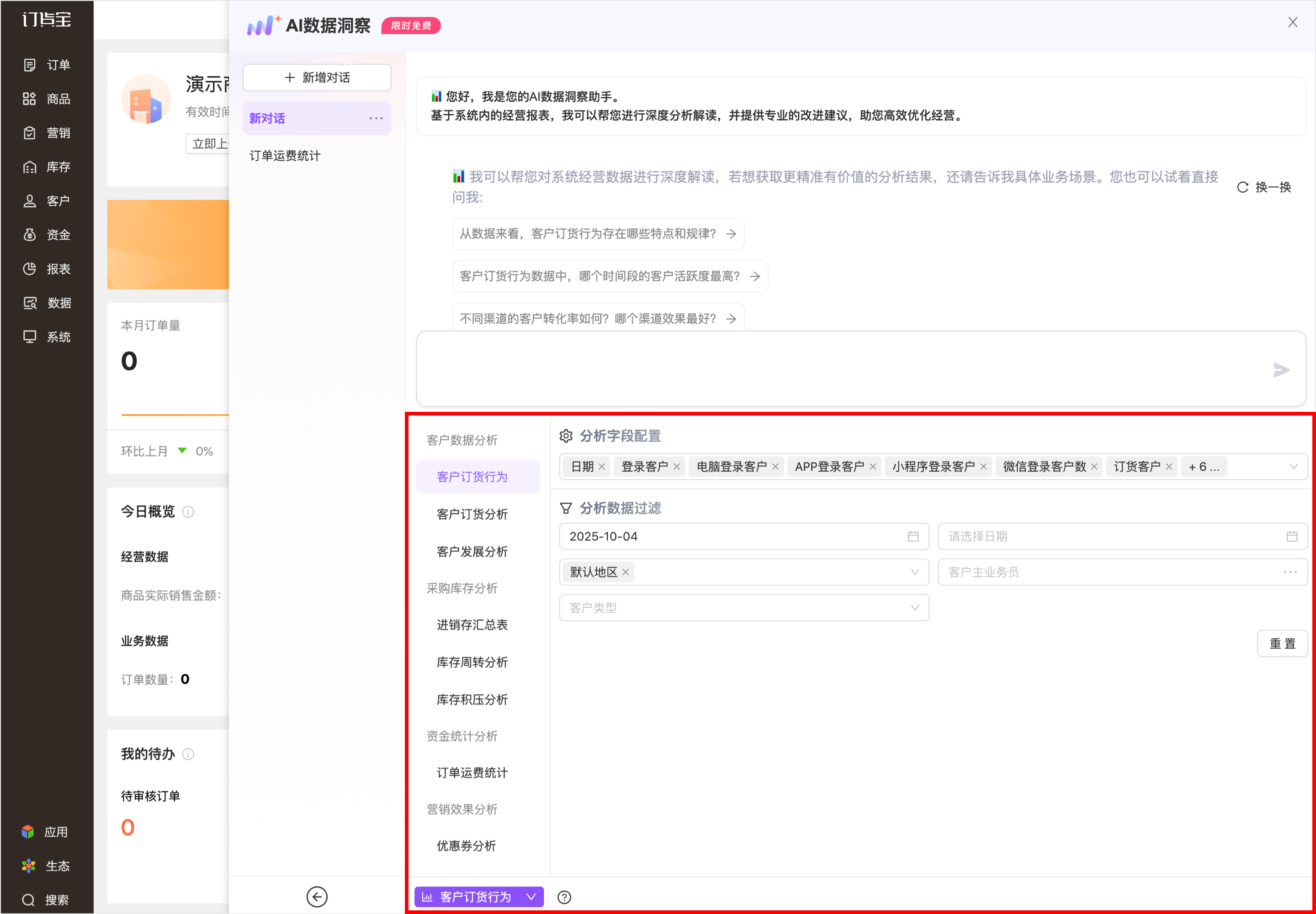 3、也可以直接从 单个报表 进入。点击报表页面右上角【AI数据洞察】按钮,默认进入该报表的 AI 数据洞察对话框。支持的报表包括:客户订货行为、客户订货分析、客户发展分析、订单运费统计、优惠券分析、满立惠分析、商品促销分析 等。