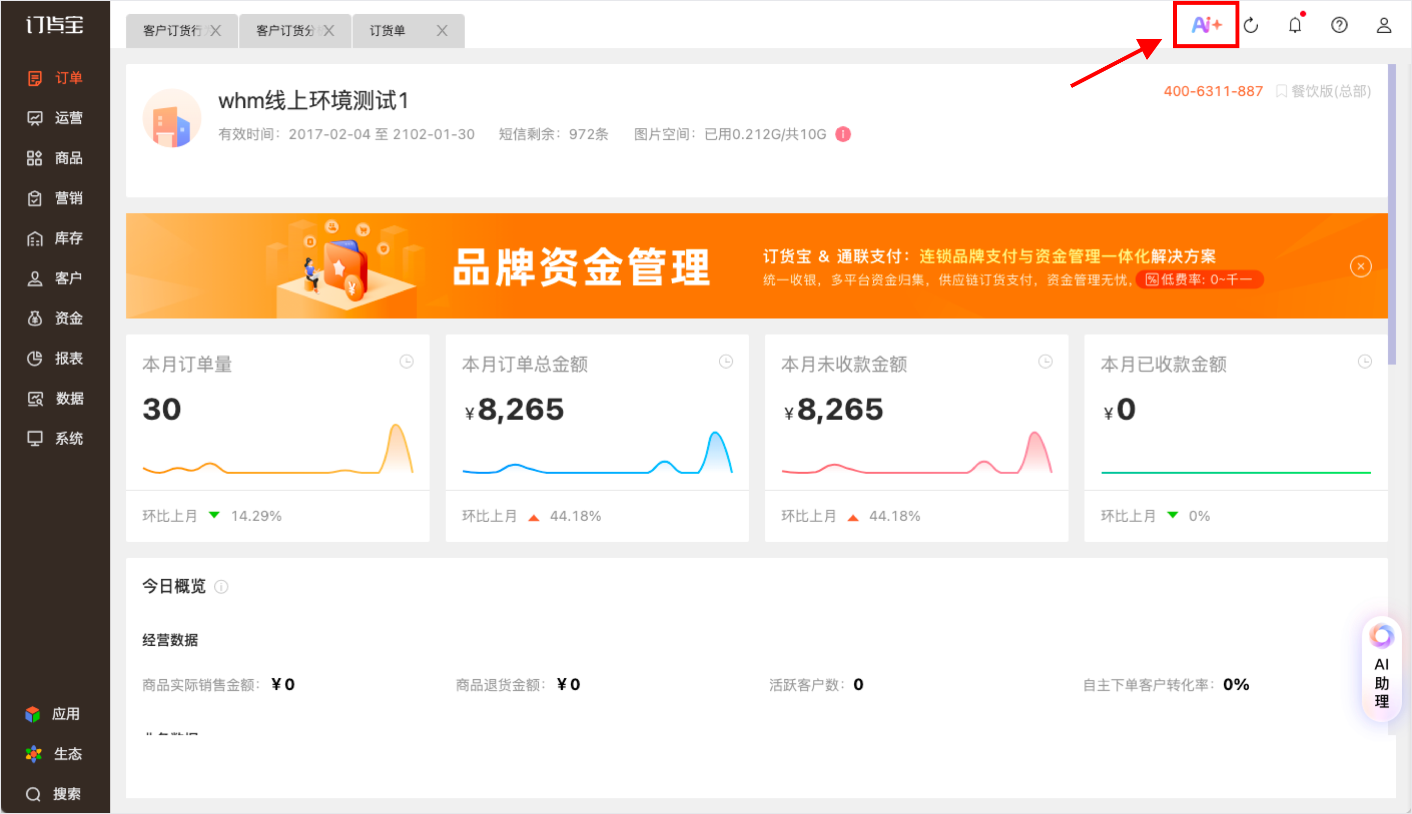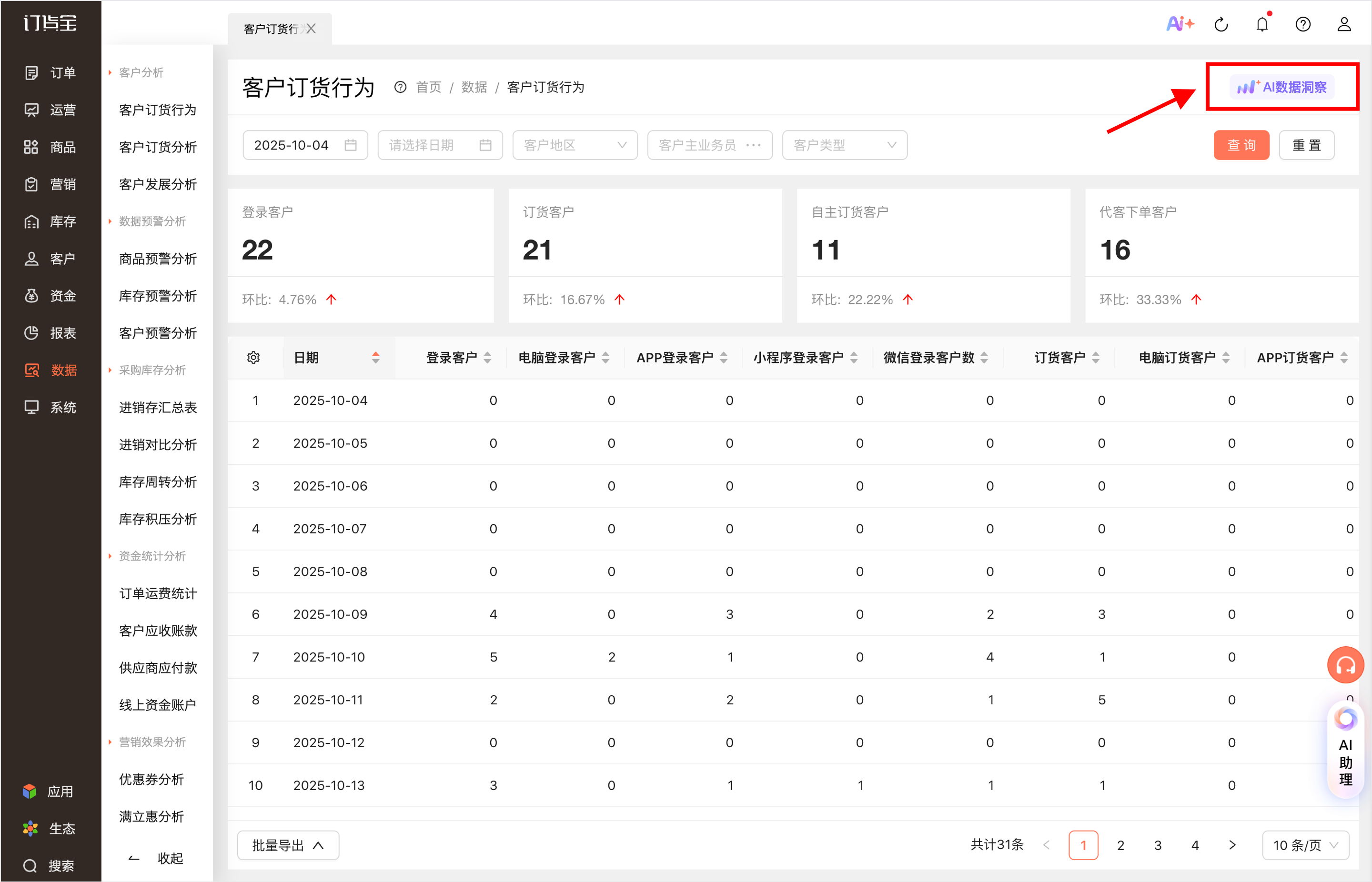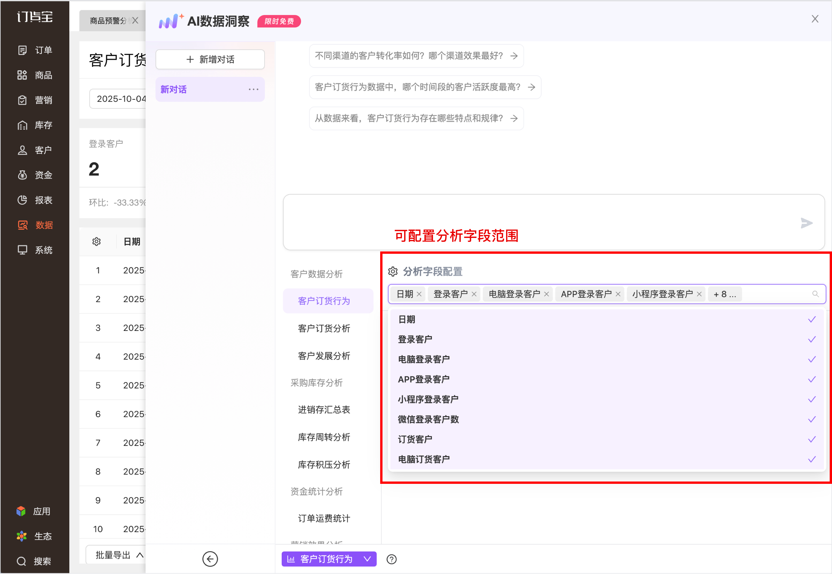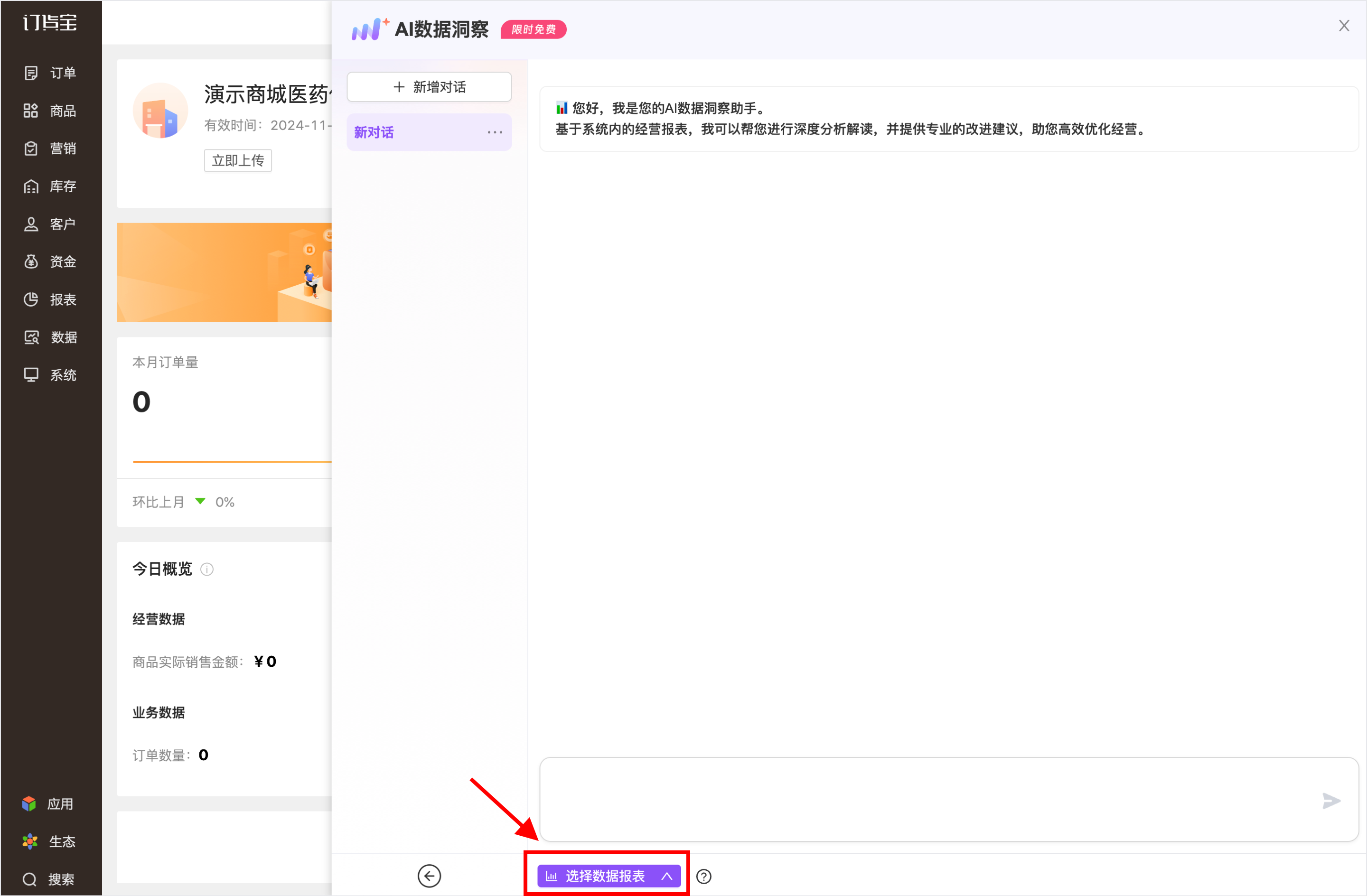 3、也可以直接从 单个报表 进入。点击报表页面右上角【AI数据洞察】按钮,默认进入该报表的 AI 数据洞察对话框。支持的报表包括:客户订货行为、客户订货分析、客户发展分析、订单运费统计、优惠券分析、满立惠分析、商品促销分析 等。