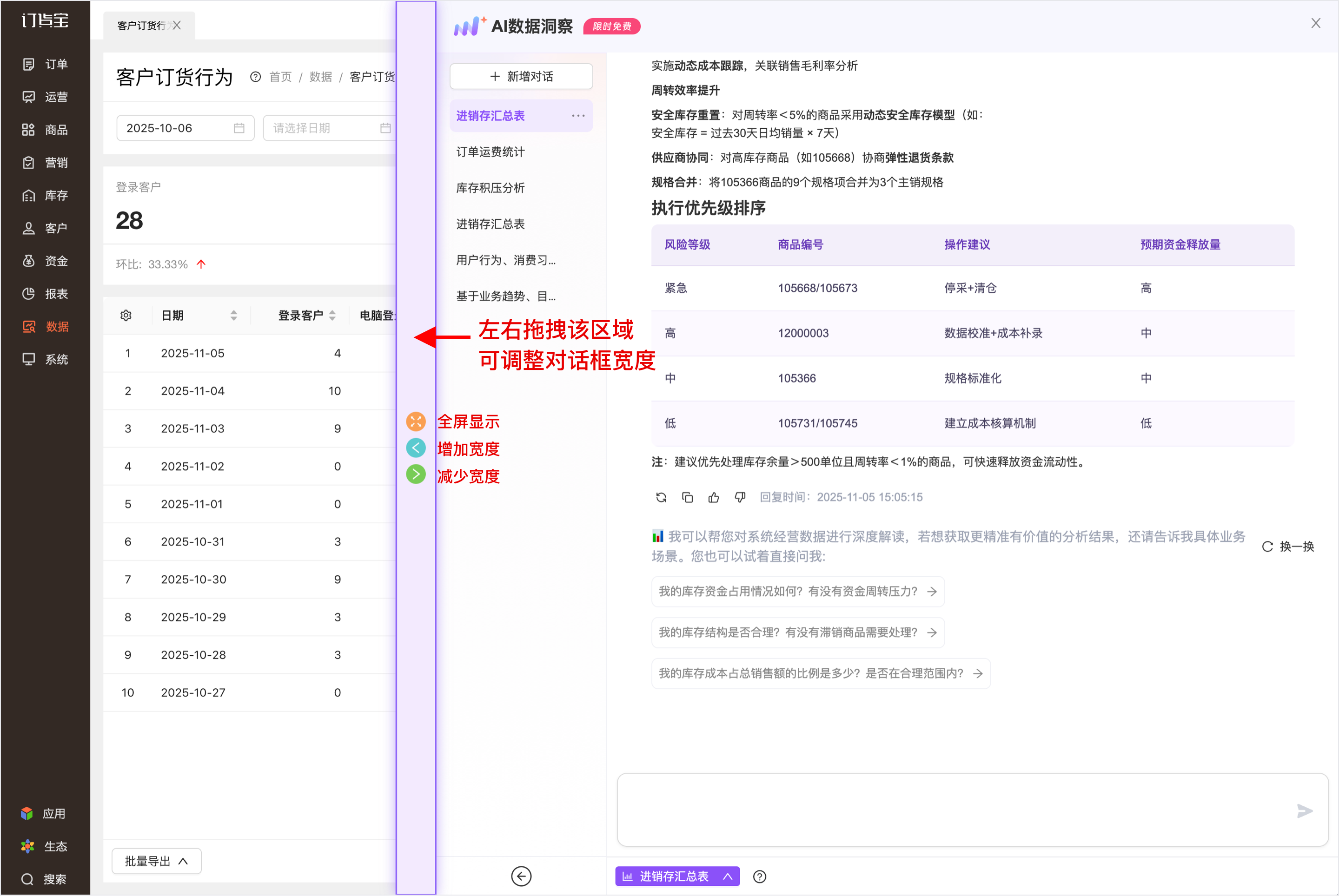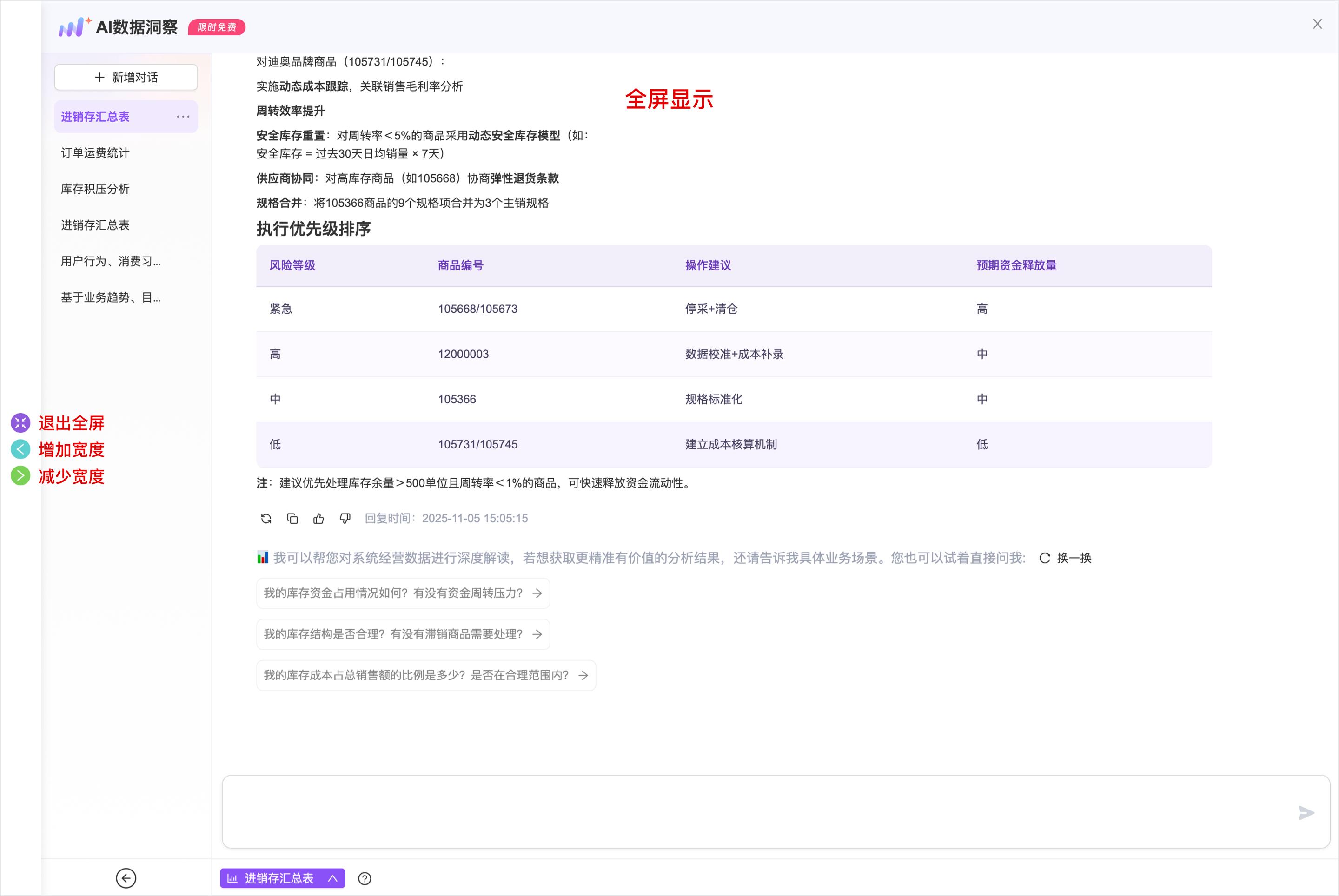 6、AI数据洞察对话框支持 宽度调整 及 全屏显示 。将鼠标移动至对话框左侧区域进行左右拖拽,即可调整显示宽度;也可通过点击“增加宽度”“减少宽度”或“全屏显示”按钮进行设置。