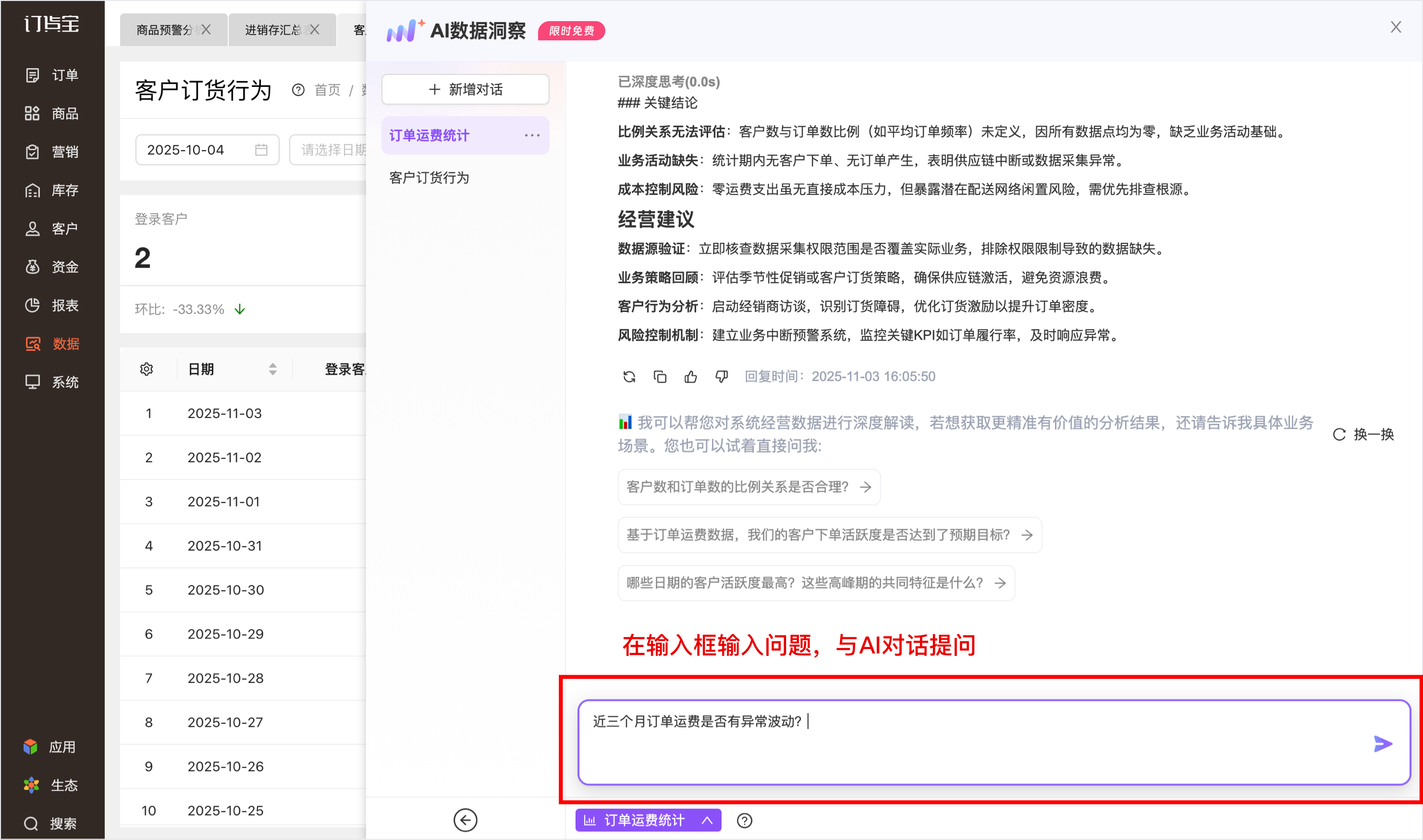 答:例如“近三个月订单运费是否有异常波动?”、“客户发展趋势是否放缓?”、“最近的促销活动效果如何?”等。AI会基于对应报表内容给出趋势洞察和优化建议。