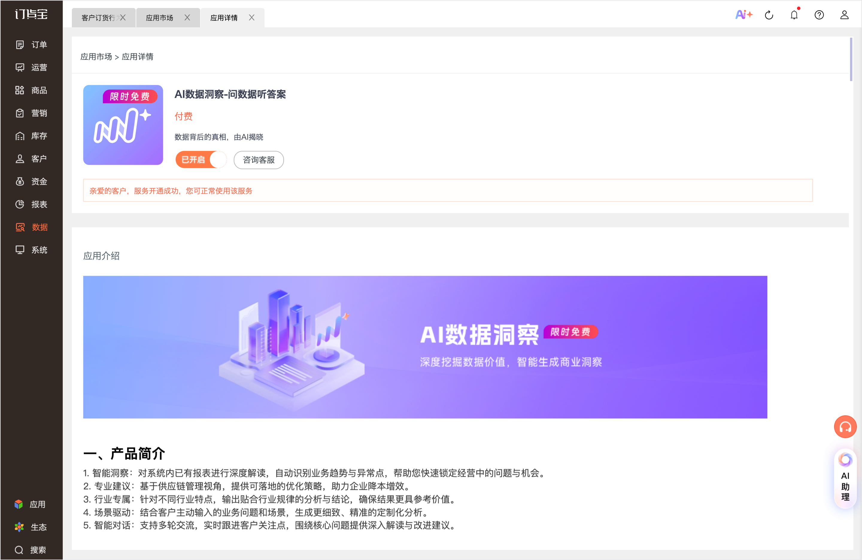 答:AI数据洞察是一款基于系统内已有报表的智能分析工具,可自动识别业务趋势与异常,提供专业优化建议,帮助企业快速发现经营问题与机会。
