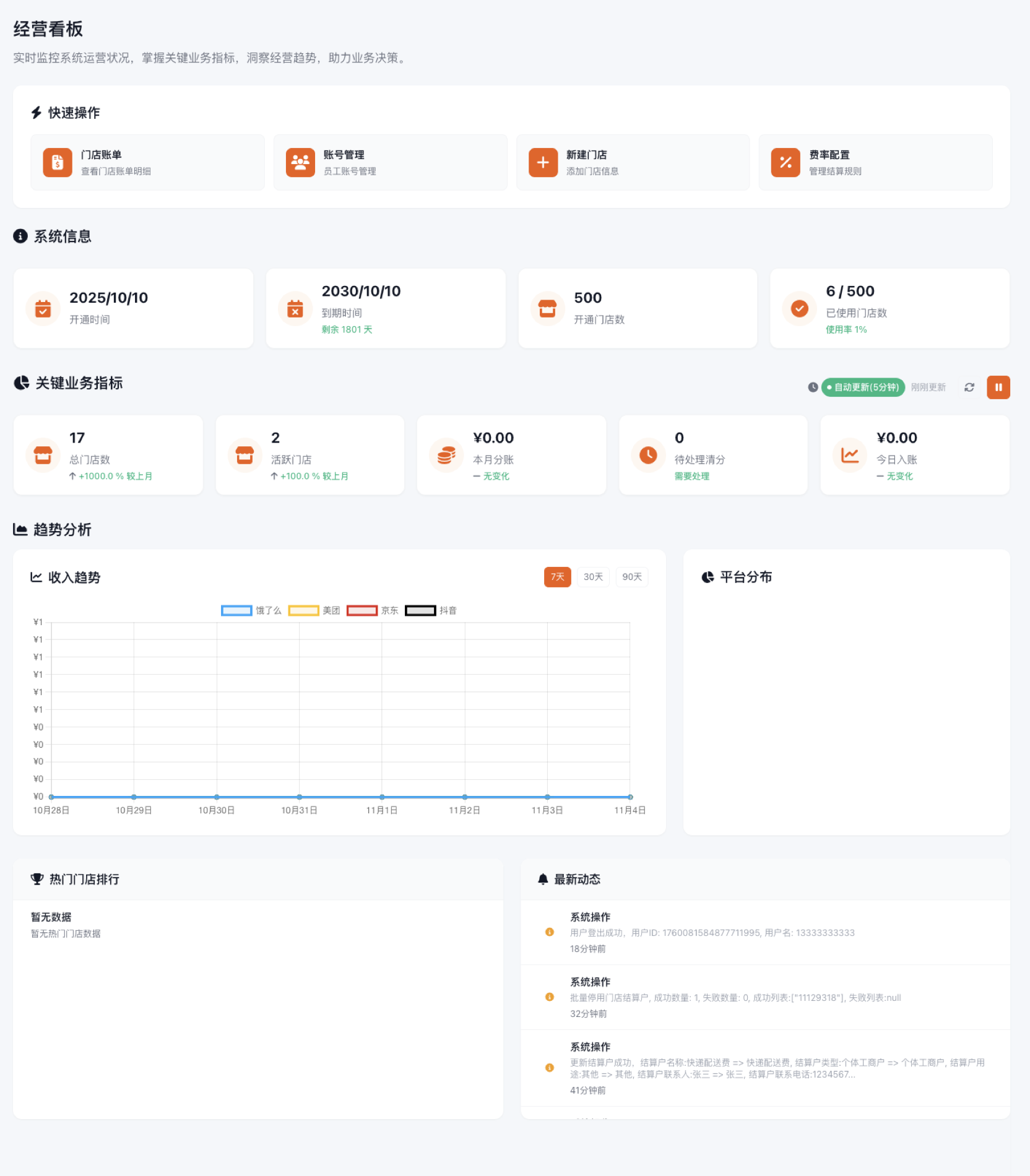 2. 实时核心指标: 关键数据(如总门店数、本月分账、今日收入)自动刷新,一目了然。