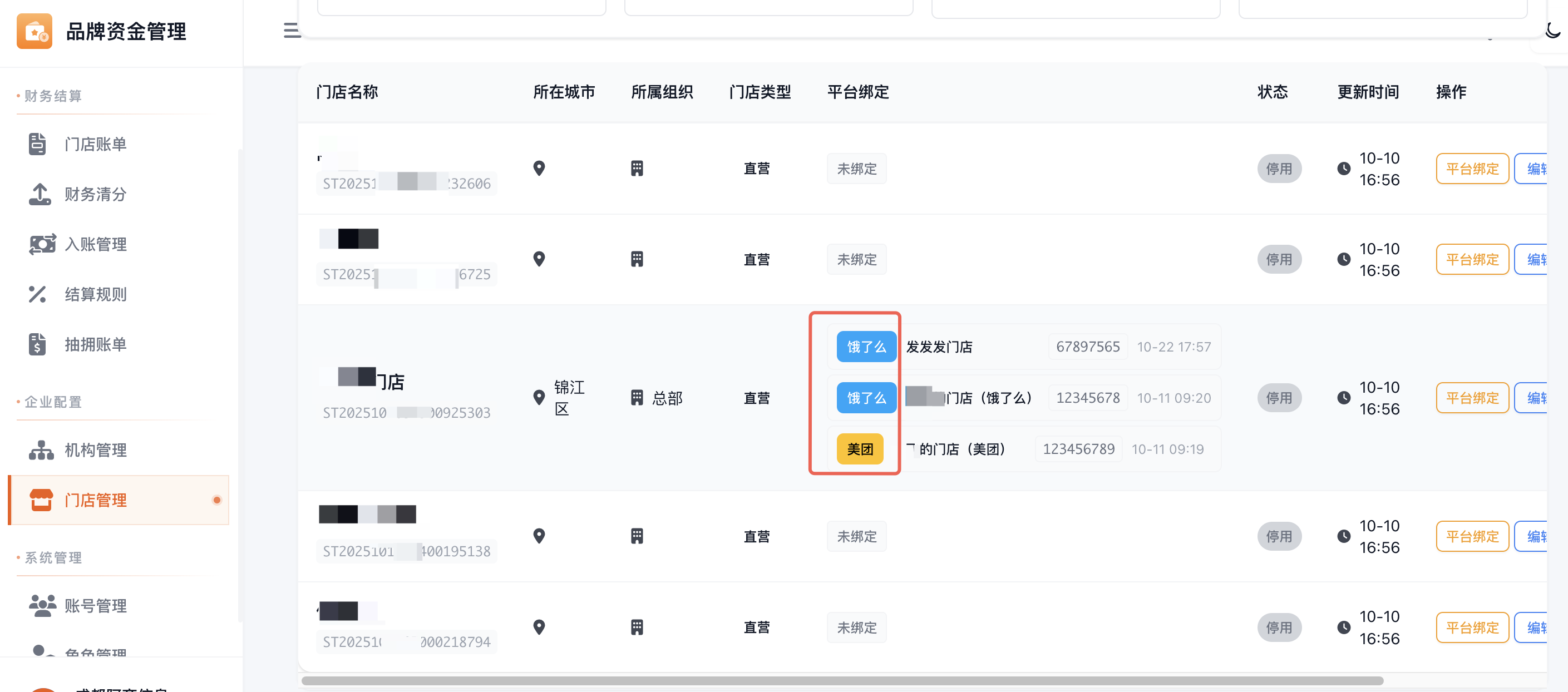 七、一个门店可以在同一个平台绑定多个店铺吗?比如xx门店在美团上开了两家店,都想绑定在一起。