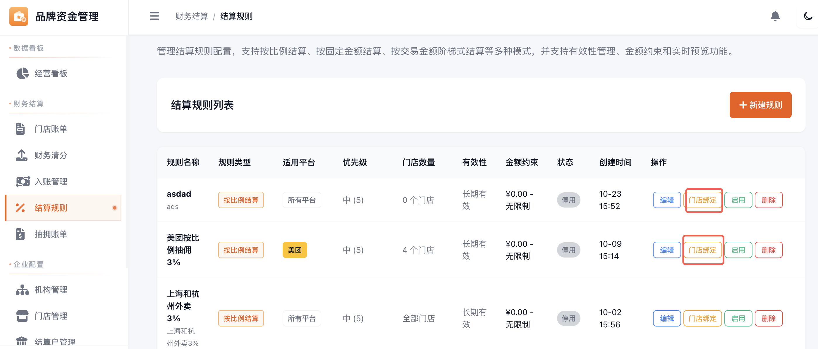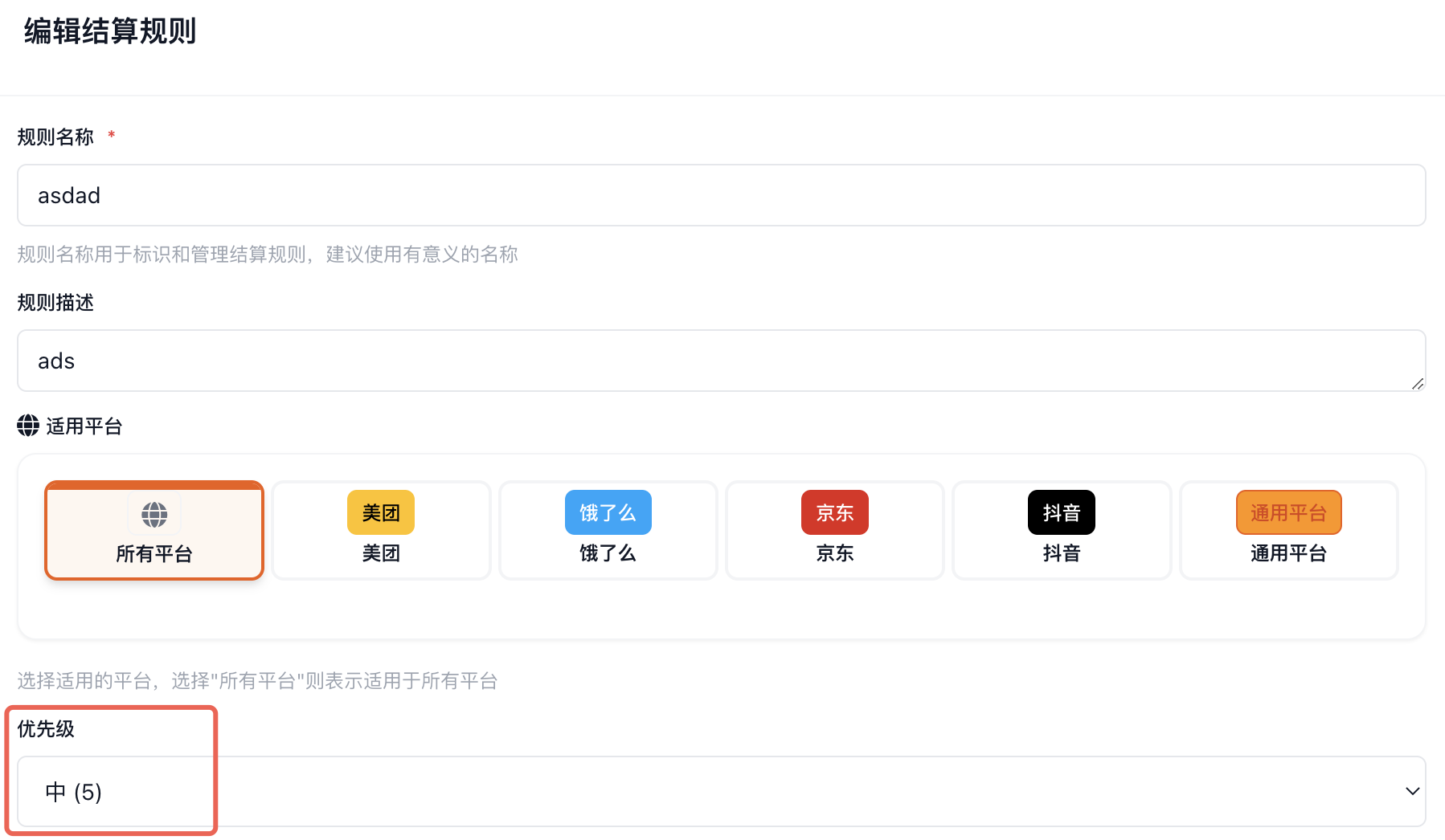 支持,设置多个结算规则,需要抽取多笔管理费用的,在对应模板中均添加对应门店即可。如下图,在门店管理中均添加该门店,则会执行多条抽佣规则,另:编辑每条规则时,优先级中添加的数字越小,优先级越高,默认数值为5。