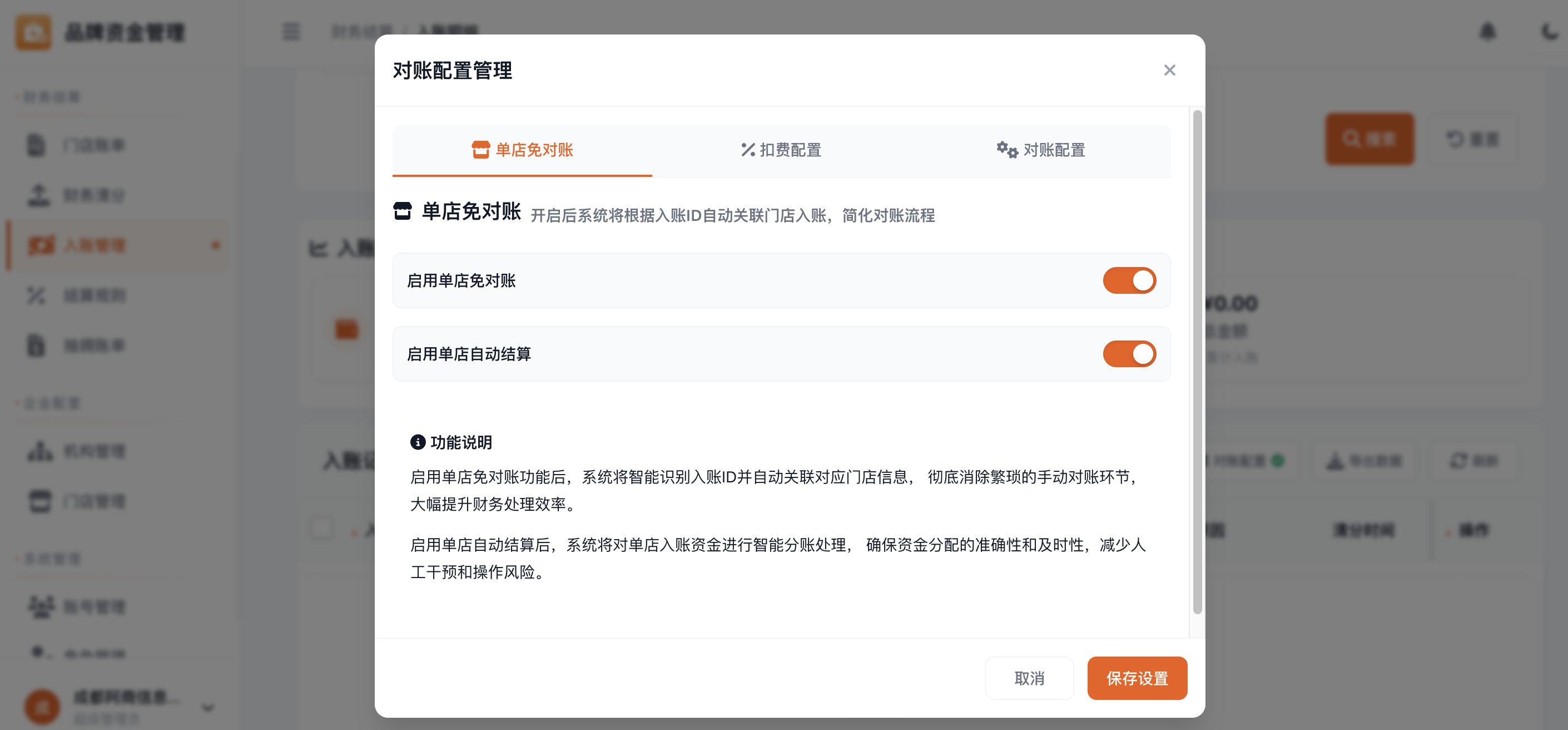 启用自动借还款功能后,系统将智能识别负数账单, 自动从品牌主账户借出相应金额进行平账处理,确保结算流程顺畅。
