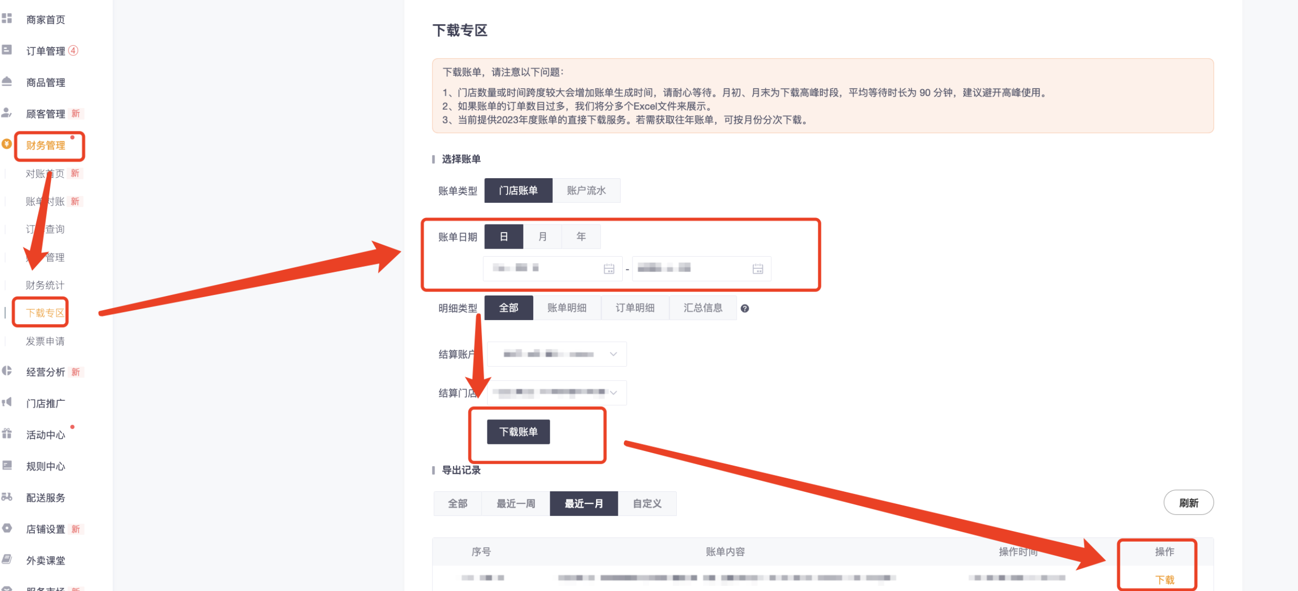 4、进入财务管理--下载专区。下载对应的账期账单(如11.4-11.6),并将此账单上传到财务清分对账。