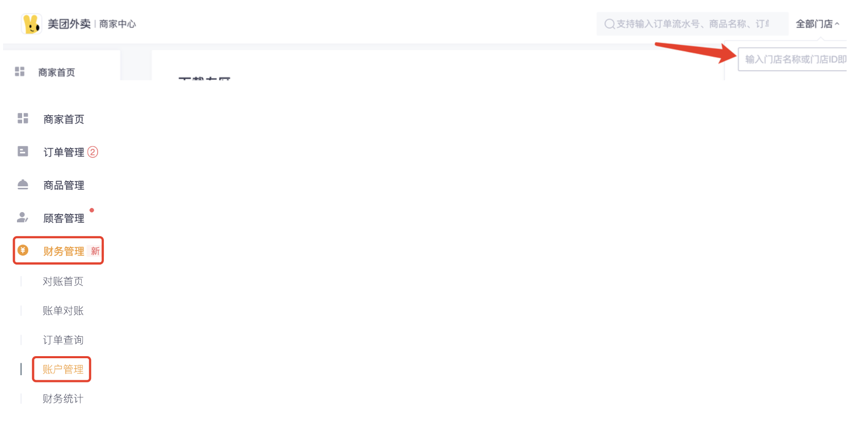 1、进入美团后台,如果是美团单店账号,直接进入左侧菜单的【财务管理--账户管理】。
