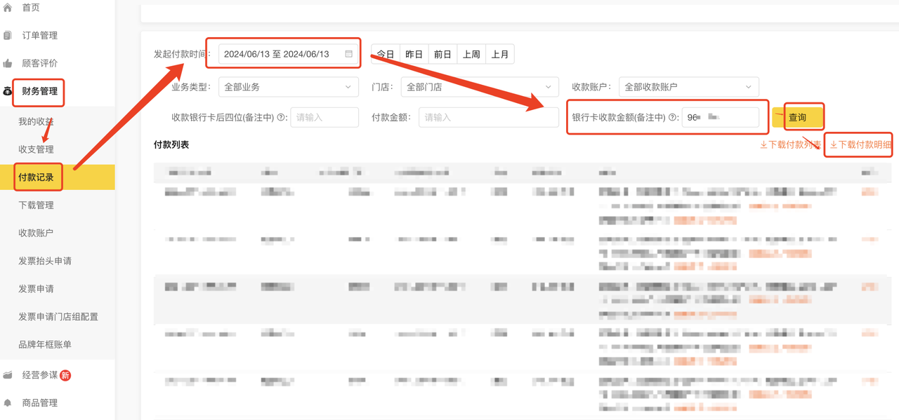 进入财务管理--付款记录模块,选择该笔入账的入账时间,在银行卡收款金额(备注中)输入入账金额,查询,下载付款明细。