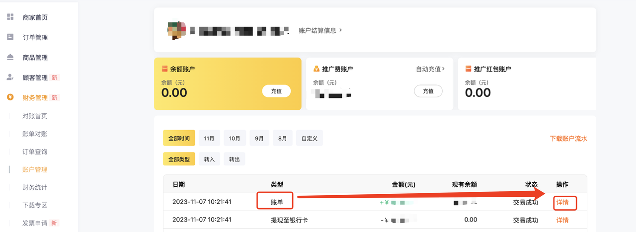 2、在美团的账户管理页面,根据相同的提现时间和提现金额,找到对应在品牌资金平台中的入账的金额。