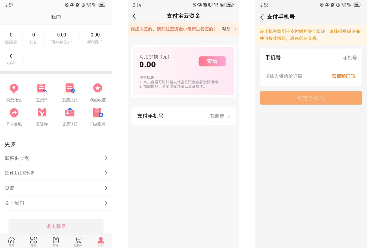 注意:门店使用余额支付时,会校验手机号收取验证码完成付款,校验的手机号可以在我的-云资金中录入手机号