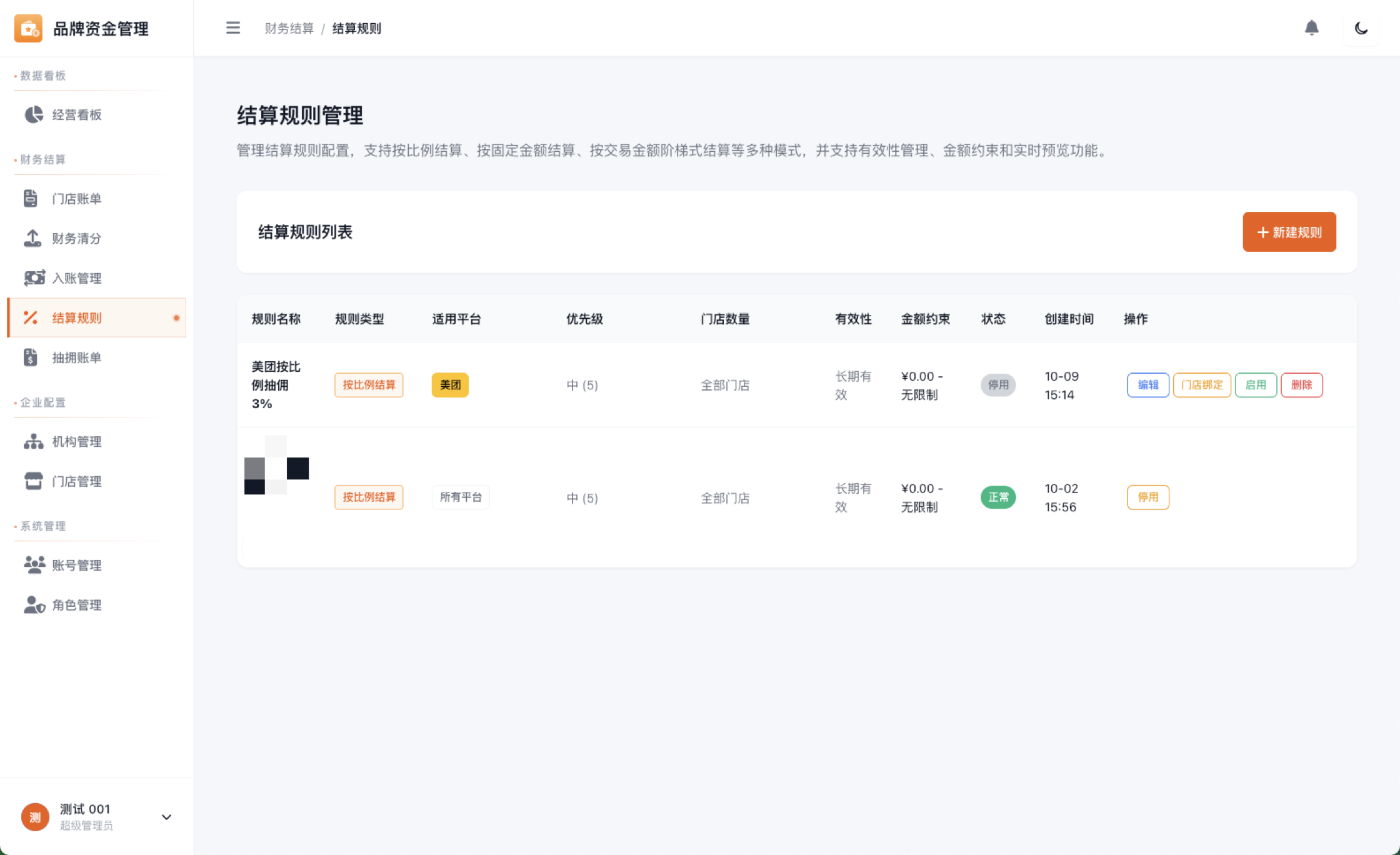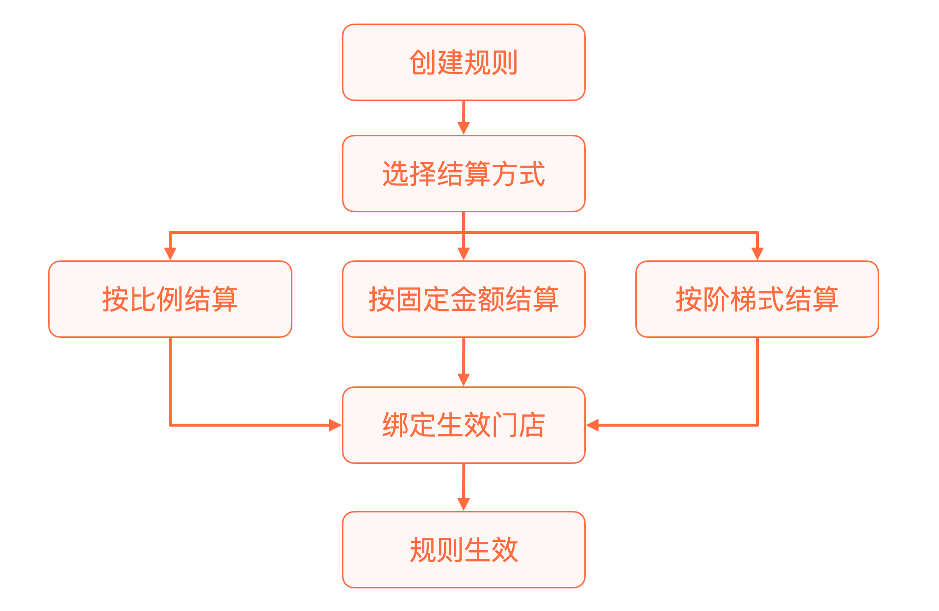 适用场景:按比例结算用于在品牌方与门店间按预设比例分配交易收入,适用于销售分成、平台服务费等场景。