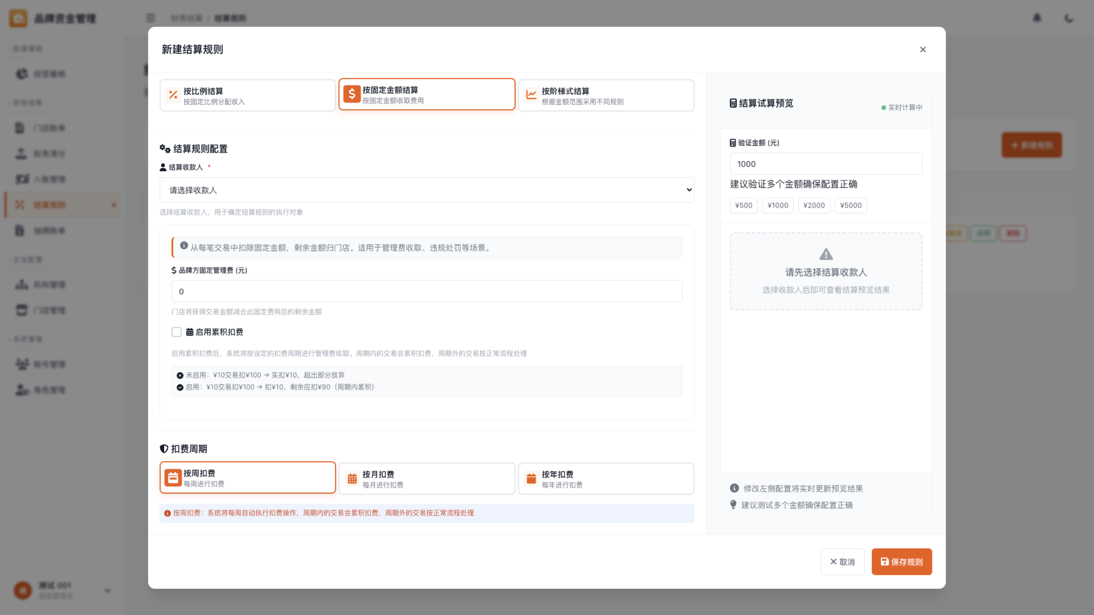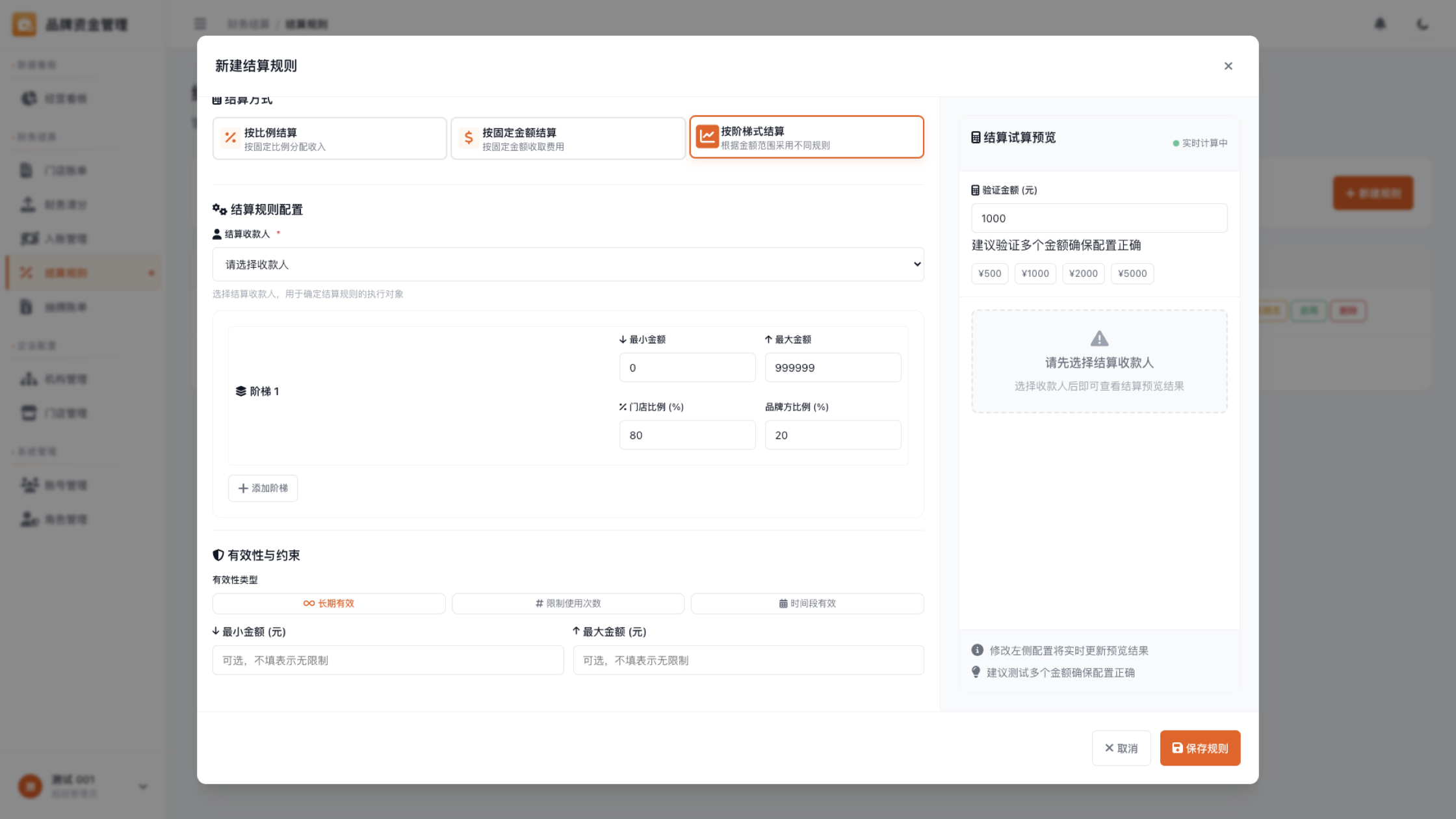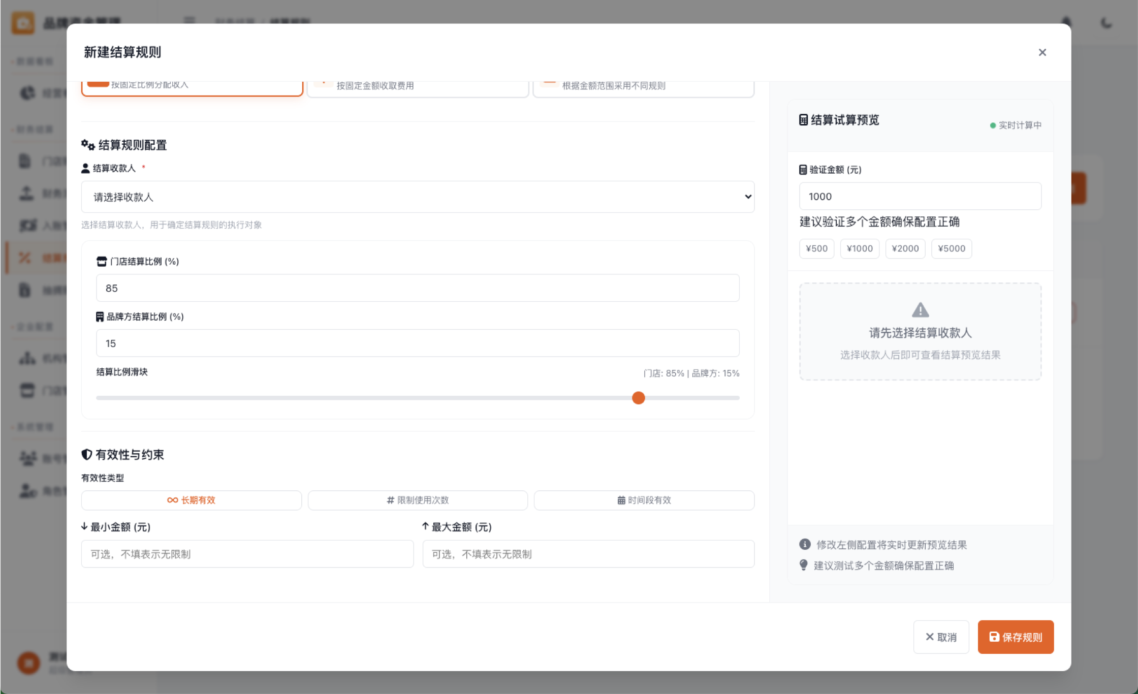 功能概述:配置资金如何自动在品牌方与门店之间进行分配,支持多种复杂业务场景。
