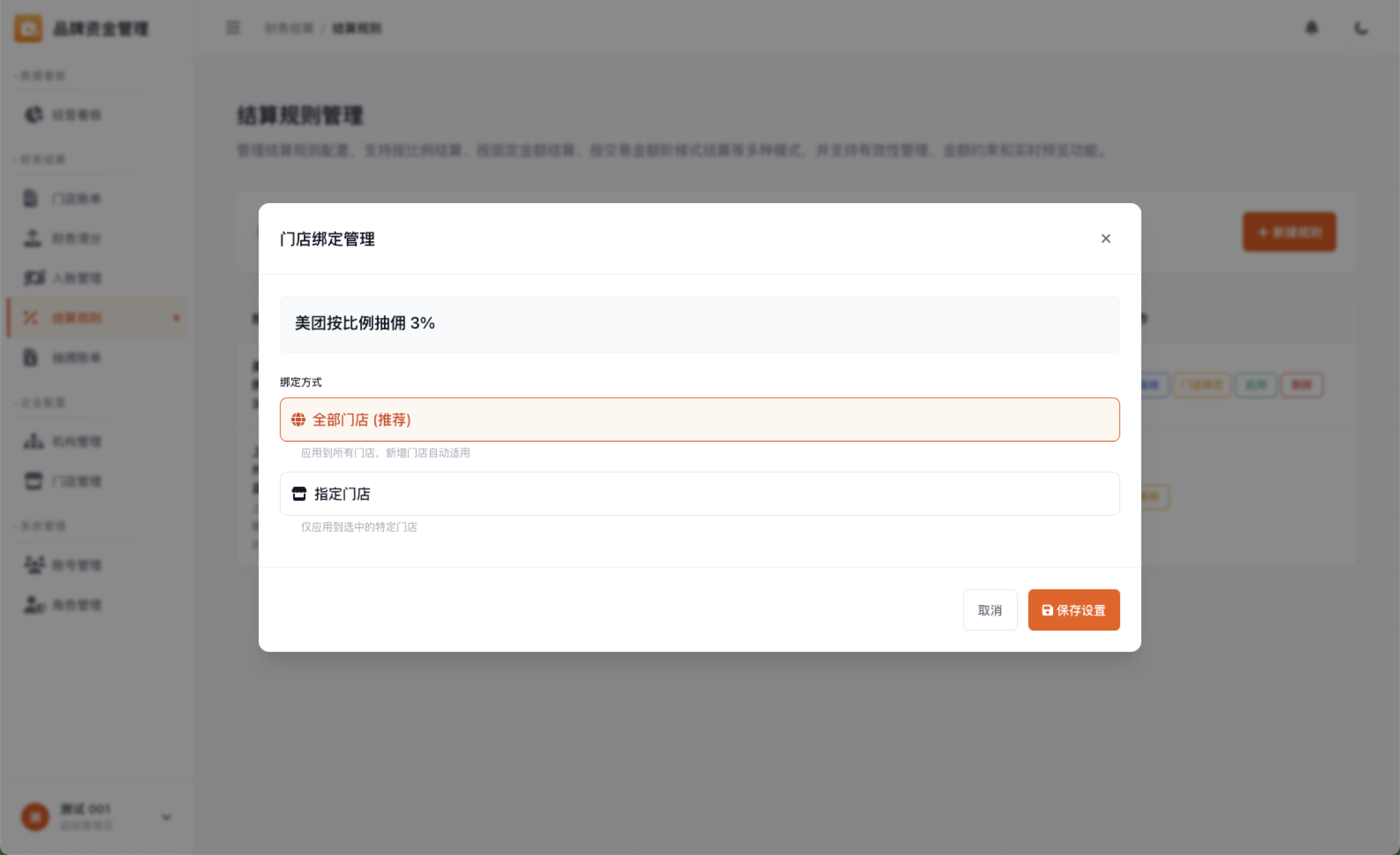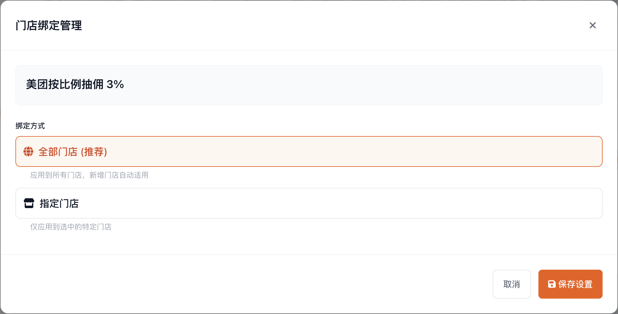 - 自动继承: 后续新增门店将自动绑定此规则。
