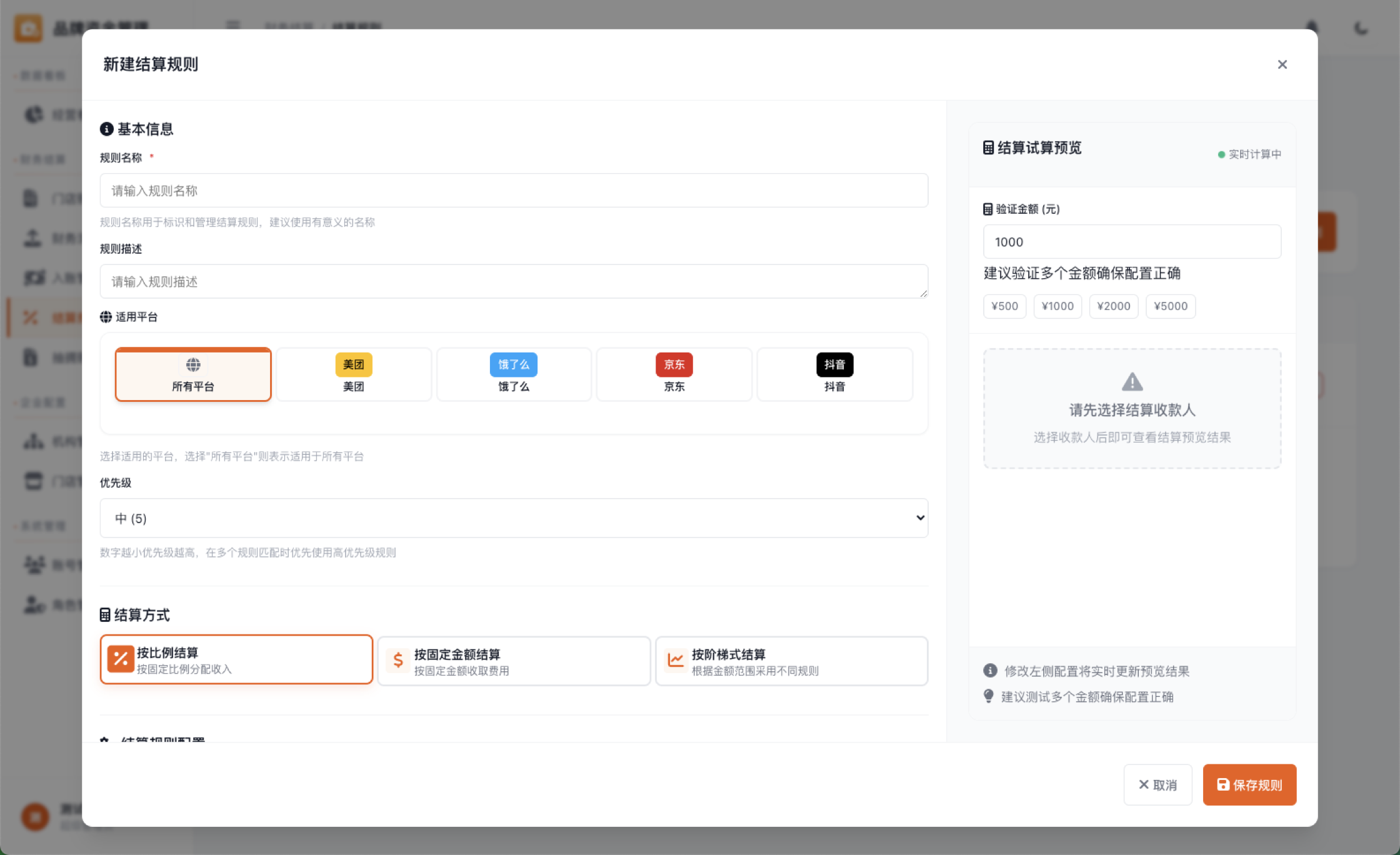 配置建议: 为不同平台(如美团、饿了么)设置不同的分成比例,并通过优先级控制执行顺序。