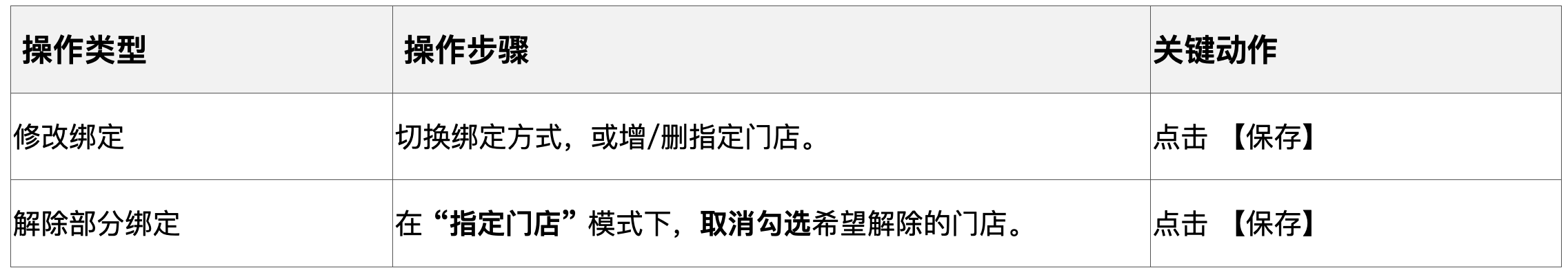 - 找到目标规则,点击「操作」列中的「门店绑定」按钮