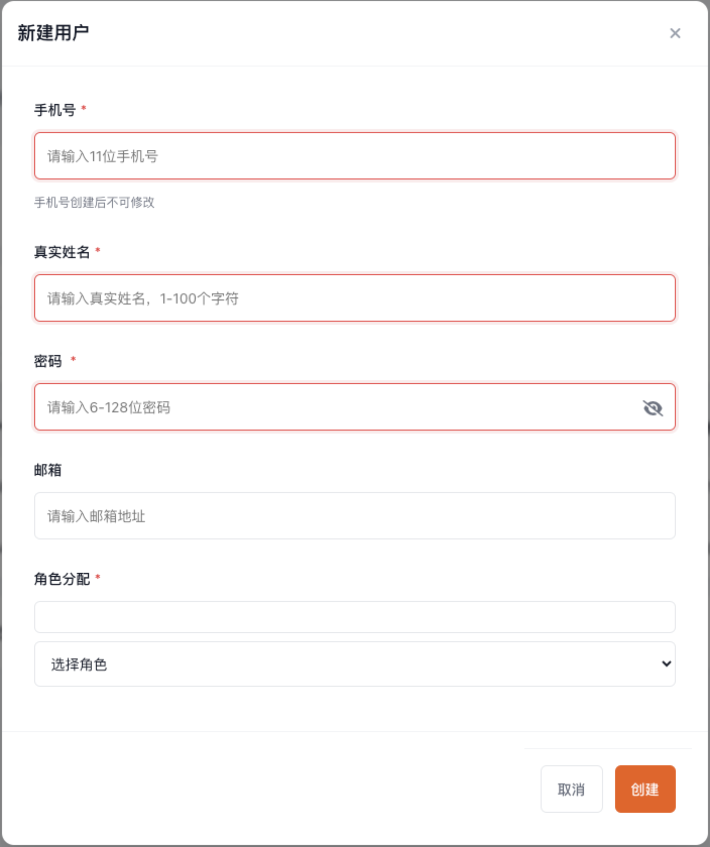 - 手机号 (必填):作为登录账号,创建后不可修改