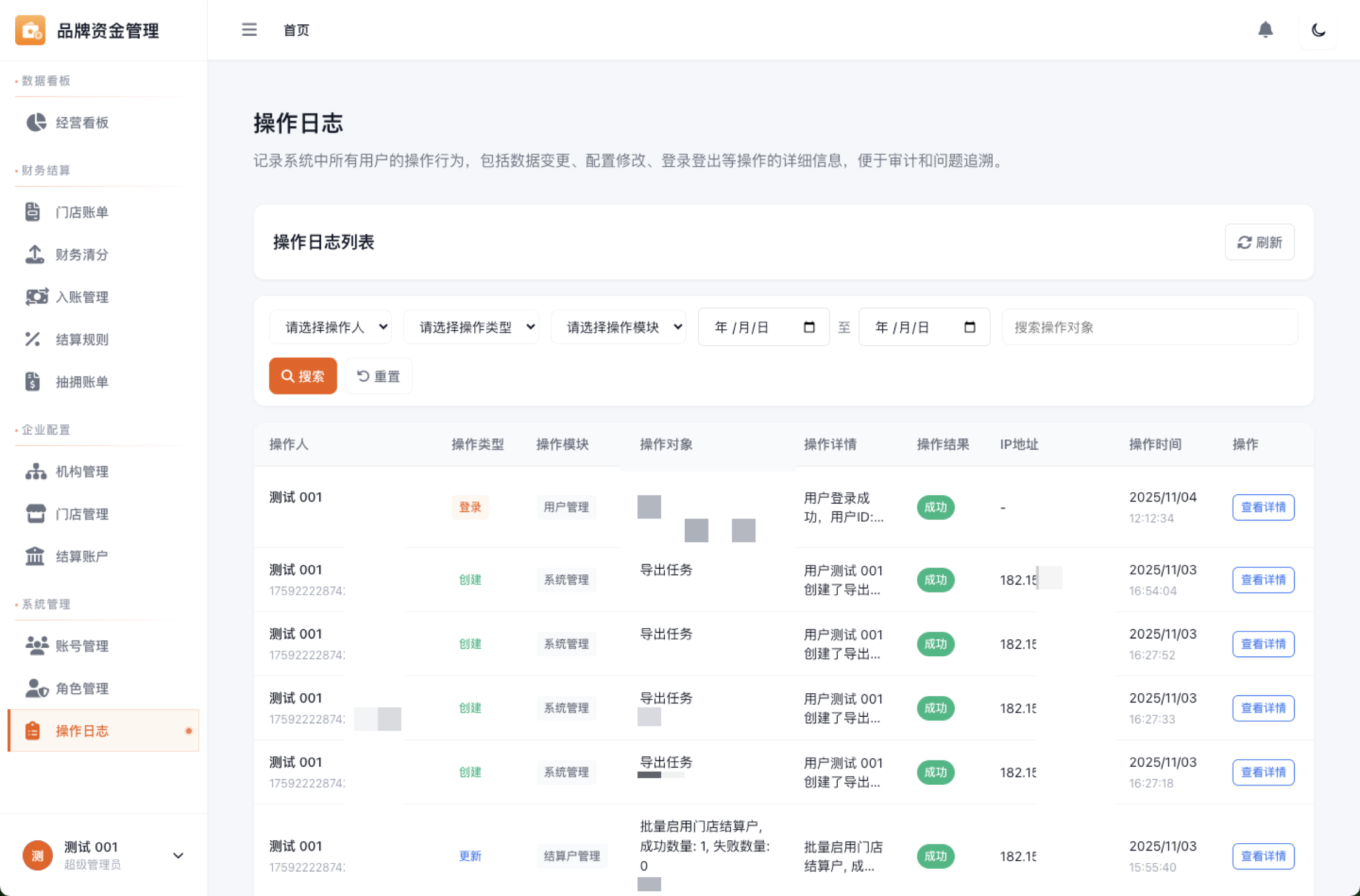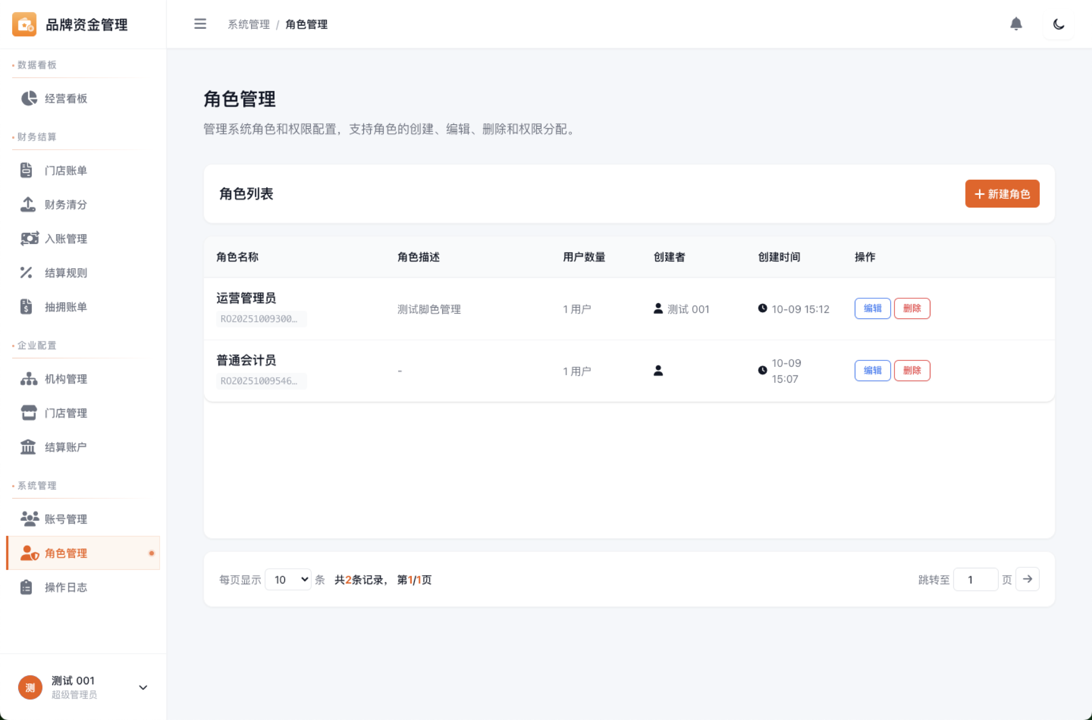 最佳实践: 建议根据组织架构预设角色(如:总部管理员、门店运营),避免为每个用户单独配置权限。