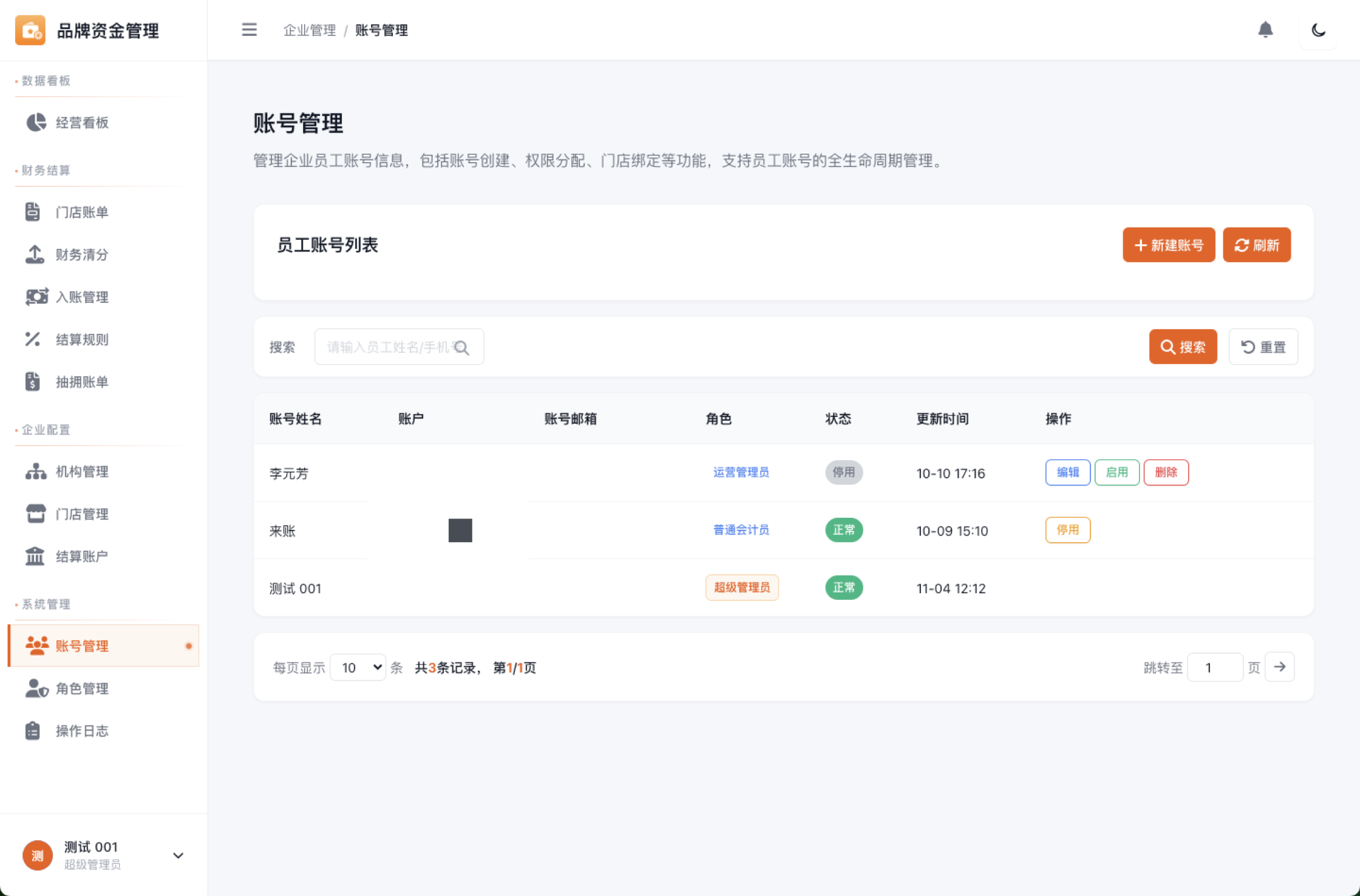 功能概述:账号管理系统用于管理企业员工账号信息,支持账号创建、权限分配、门店绑定等功能,实现员工账号的全生命周期管理。