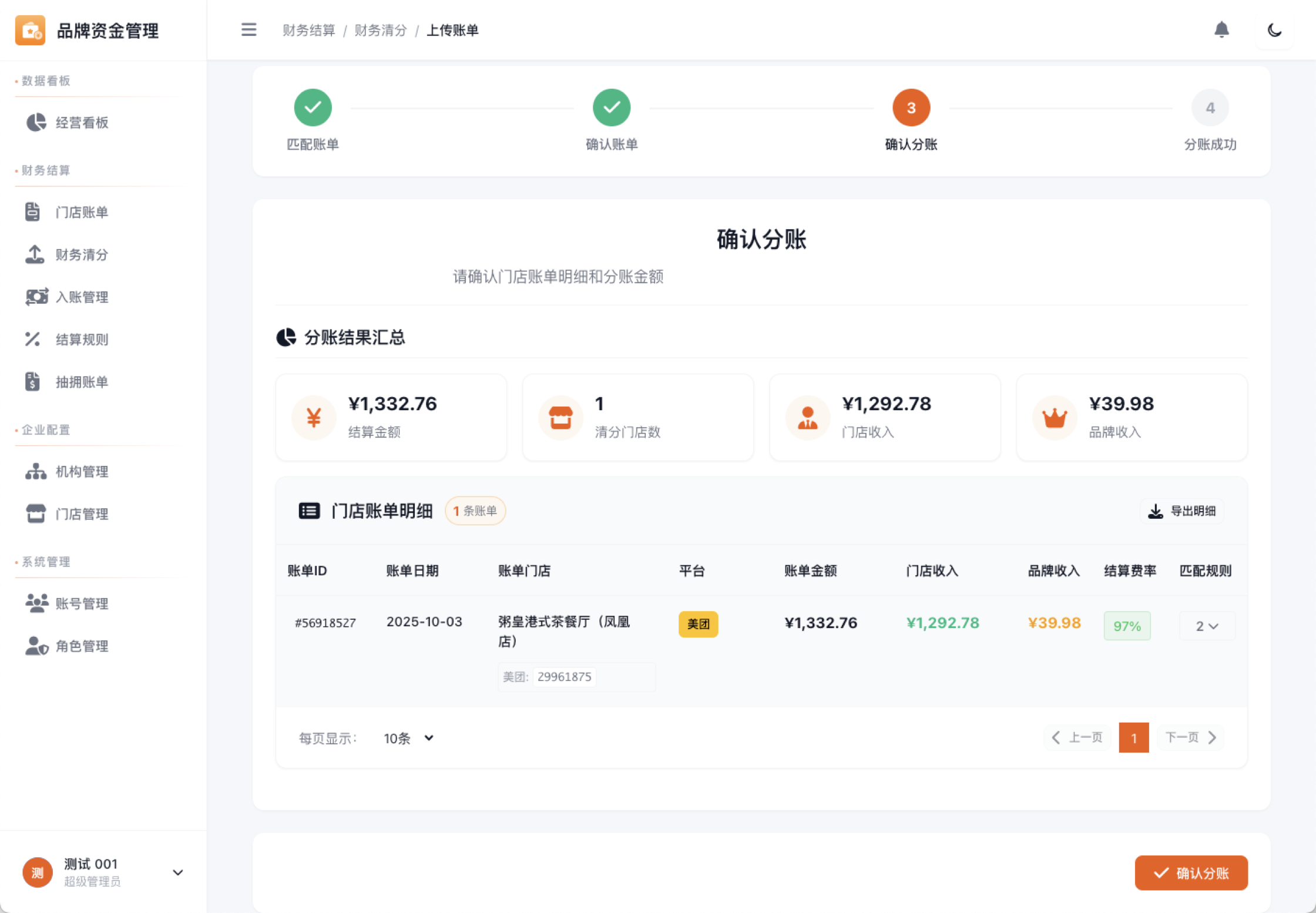 财务清分 — 确认账单