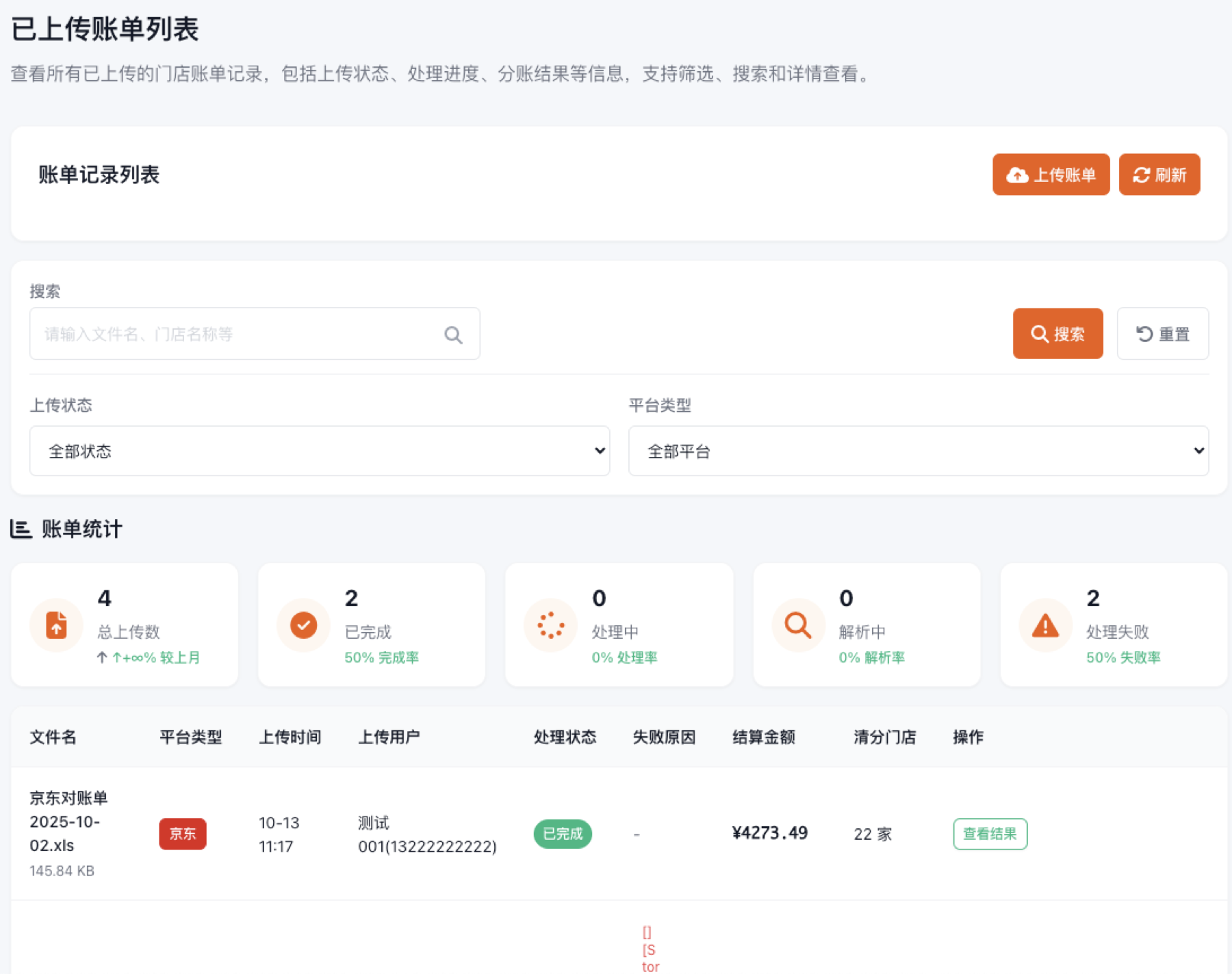- 处理失败:处理失败的账单数,失败率 = 处理失败/总上传数