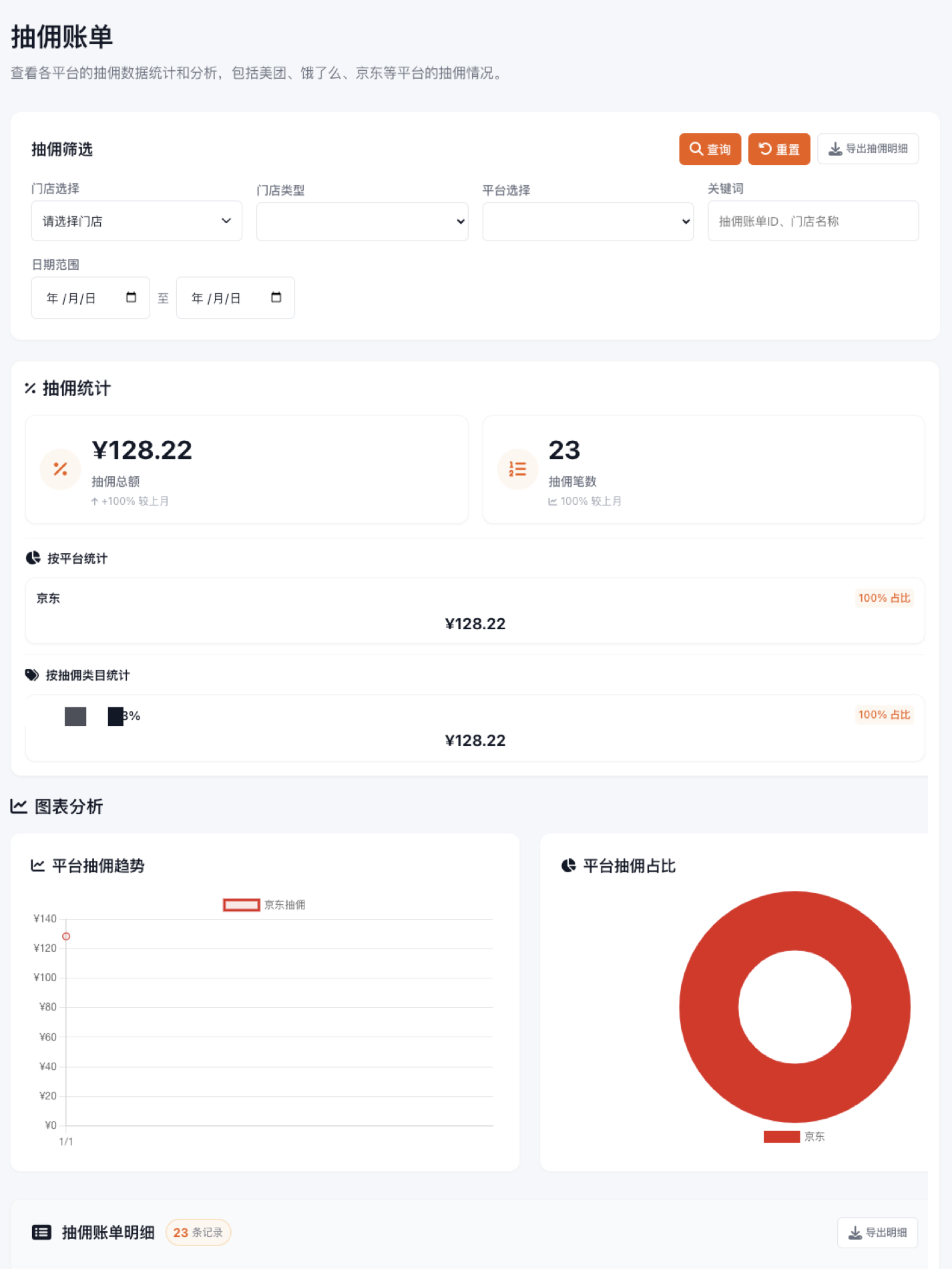 应用场景:抽佣账单模块用于查看各平台(如美团、饿了么、京东等)的抽佣数据统计、分析及明细查询。用户可通过筛选条件查看不同门店、平台、时间范围的抽佣情况,并支持导出明细数据。