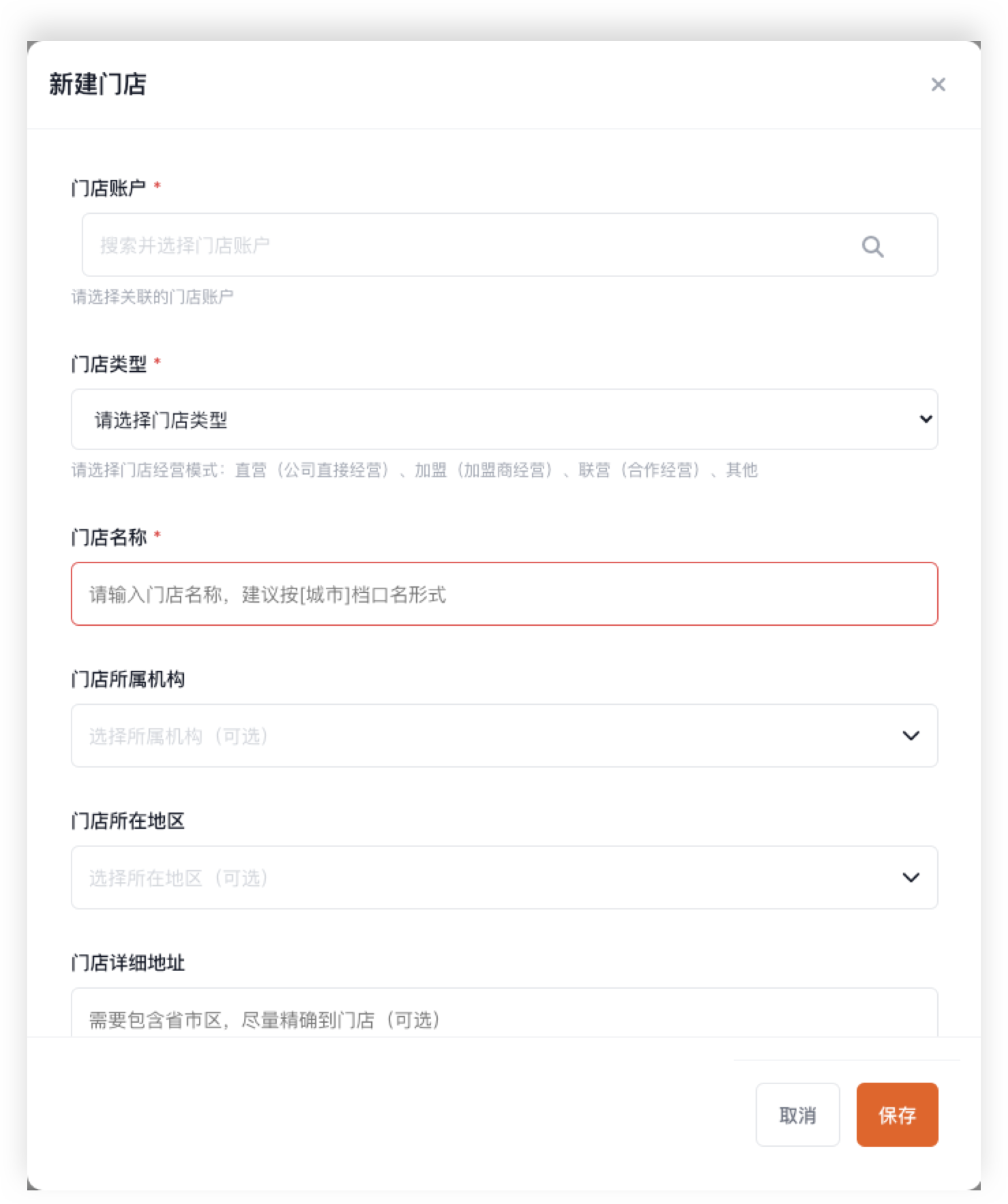 - 门店所属机构:决定了门店在组织架构中的位置,影响数据权限和报表汇总。