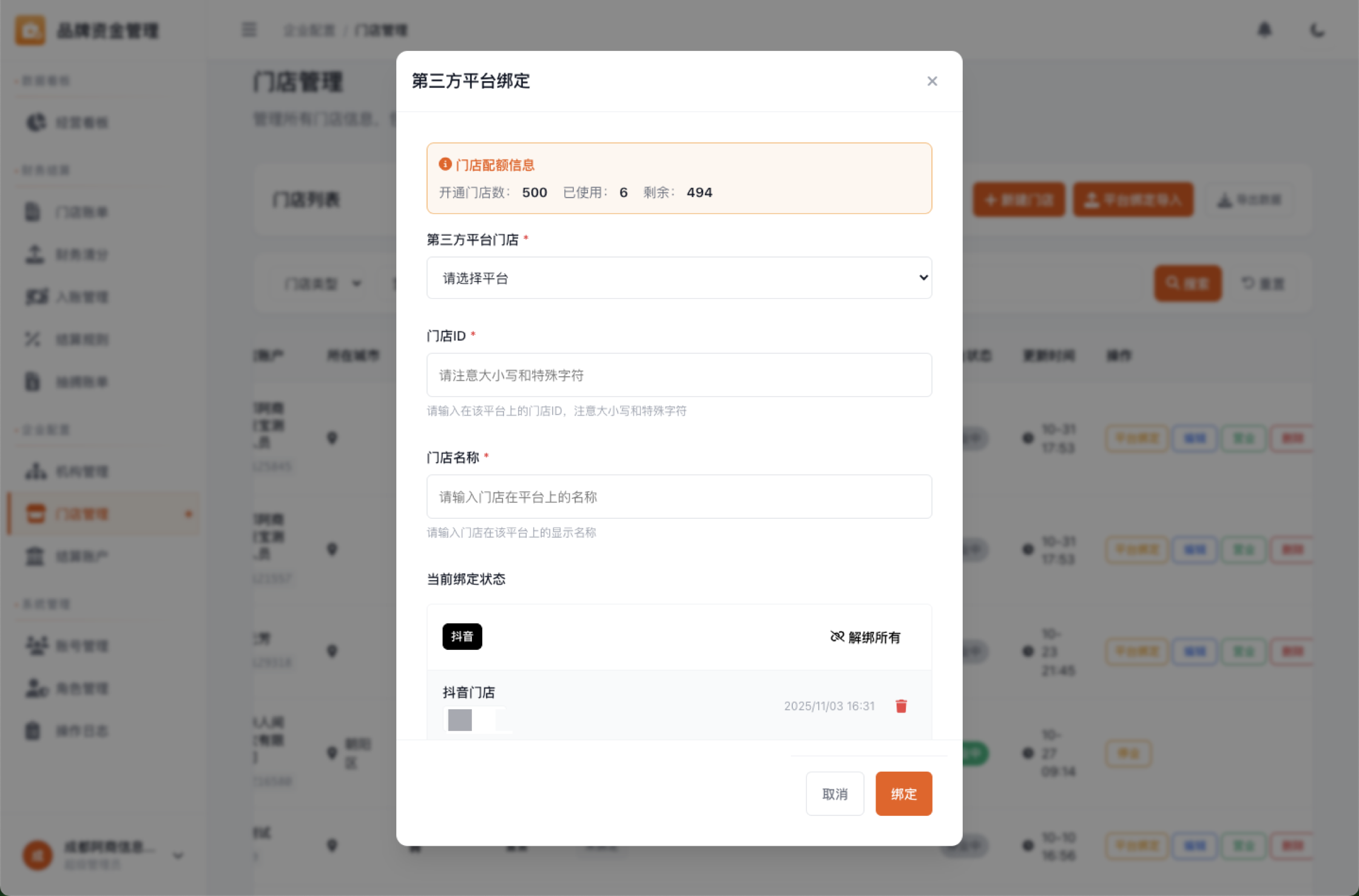 后续配置: 门店创建成功后,通常需要继续进行 【平台绑定】 操作,以便与第三方平台门店关联,实现自动对账。