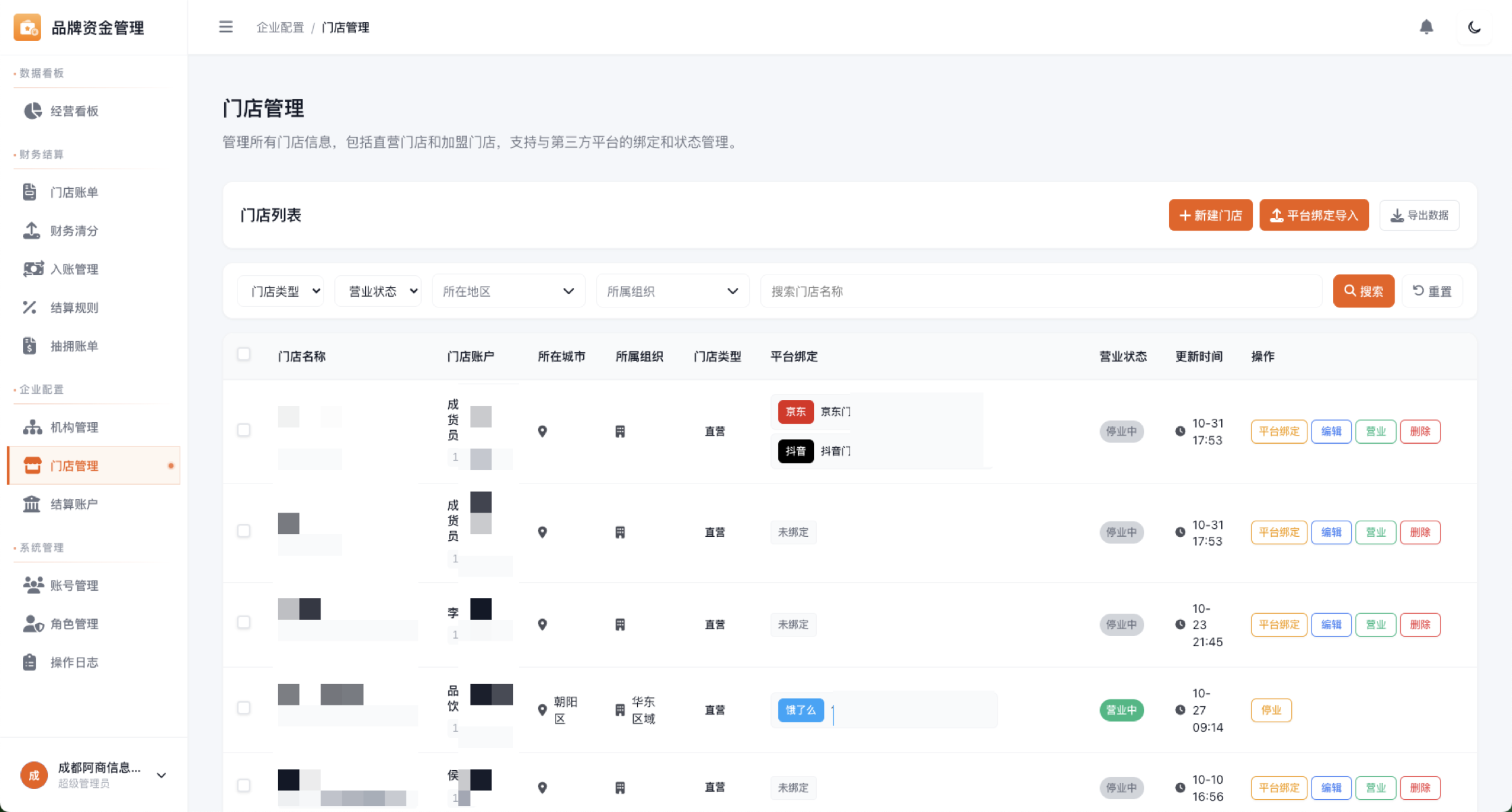 管理所有类型门店(直营、加盟、联营)的基本信息、状态及第三方平台关联。