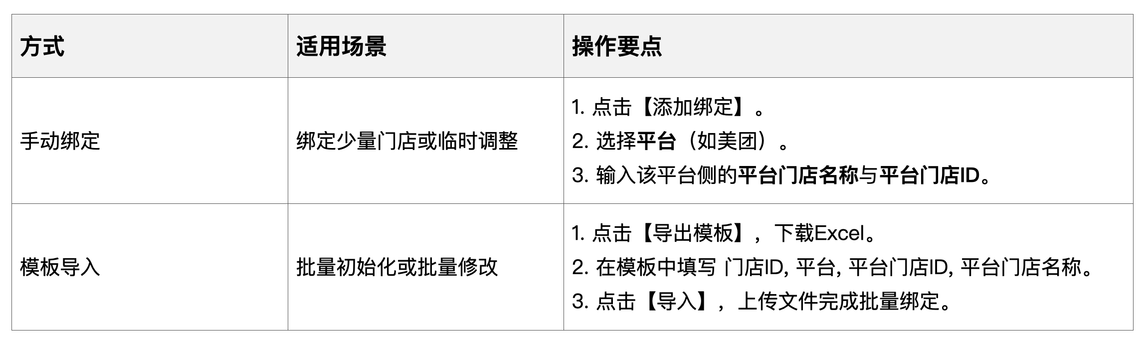 - 多对多: 一个系统门店可绑定多个不同平台的门店。(美团、饿了么等)的门店。